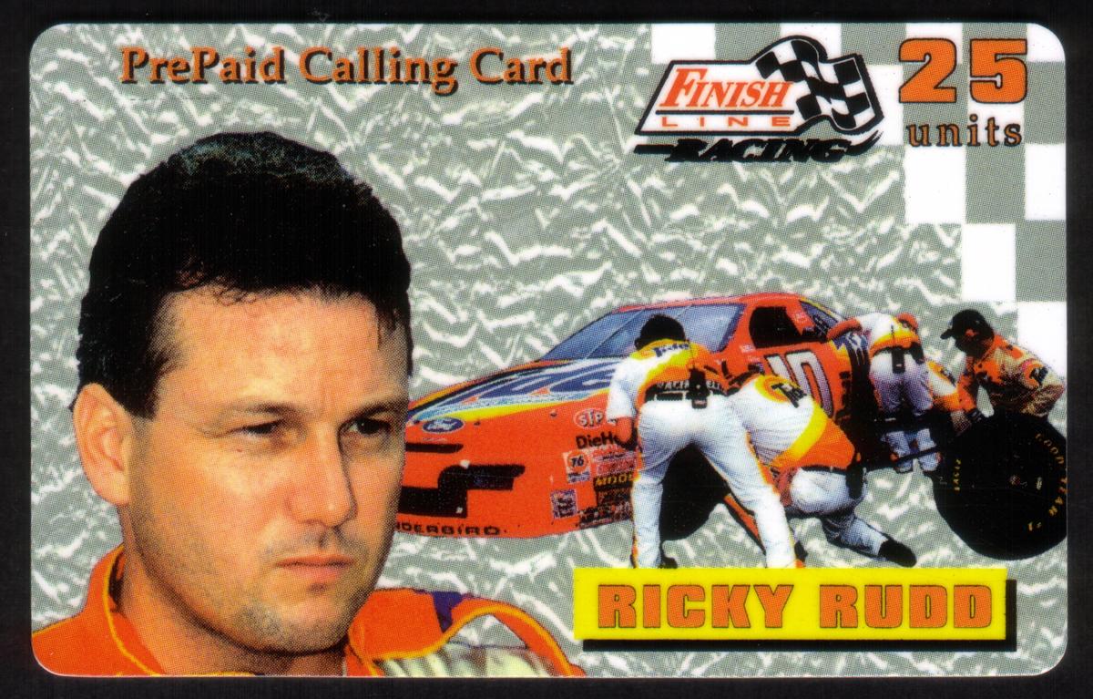 Ricky Rudd’s card shows a focused portrait of Rudd in orange racing gear with his sponsored Ford Thunderbird car undergoing pit stop maintenance. Crew members in white and orange uniforms handle tire and fuel duties. His name appears in bold yellow text on a red banner.