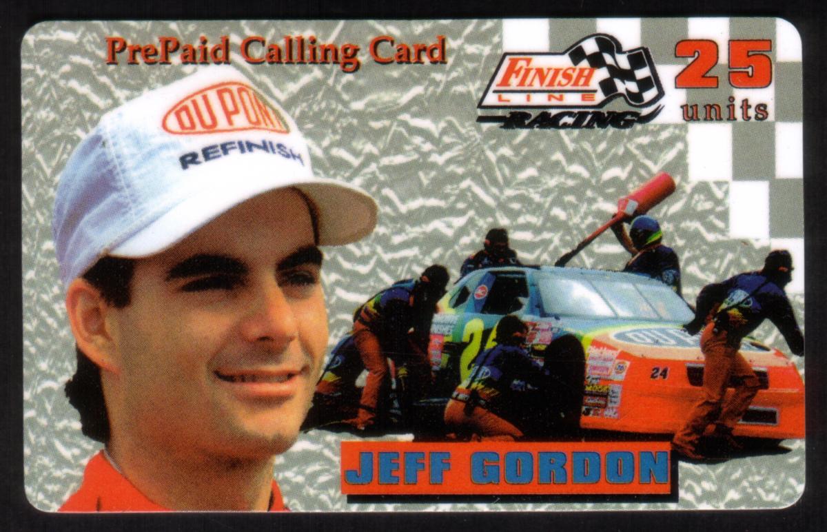 This set of four prepaid calling cards features prominent NASCAR drivers Jeff Gordon, Mark Martin, Ricky Rudd, and Rusty Wallace from the 25u Platinum Series by Finish Line Racing. Each card prominently displays the Finish Line Racing logo with a checkered flag motif and "25 units" marking the card's value in units.