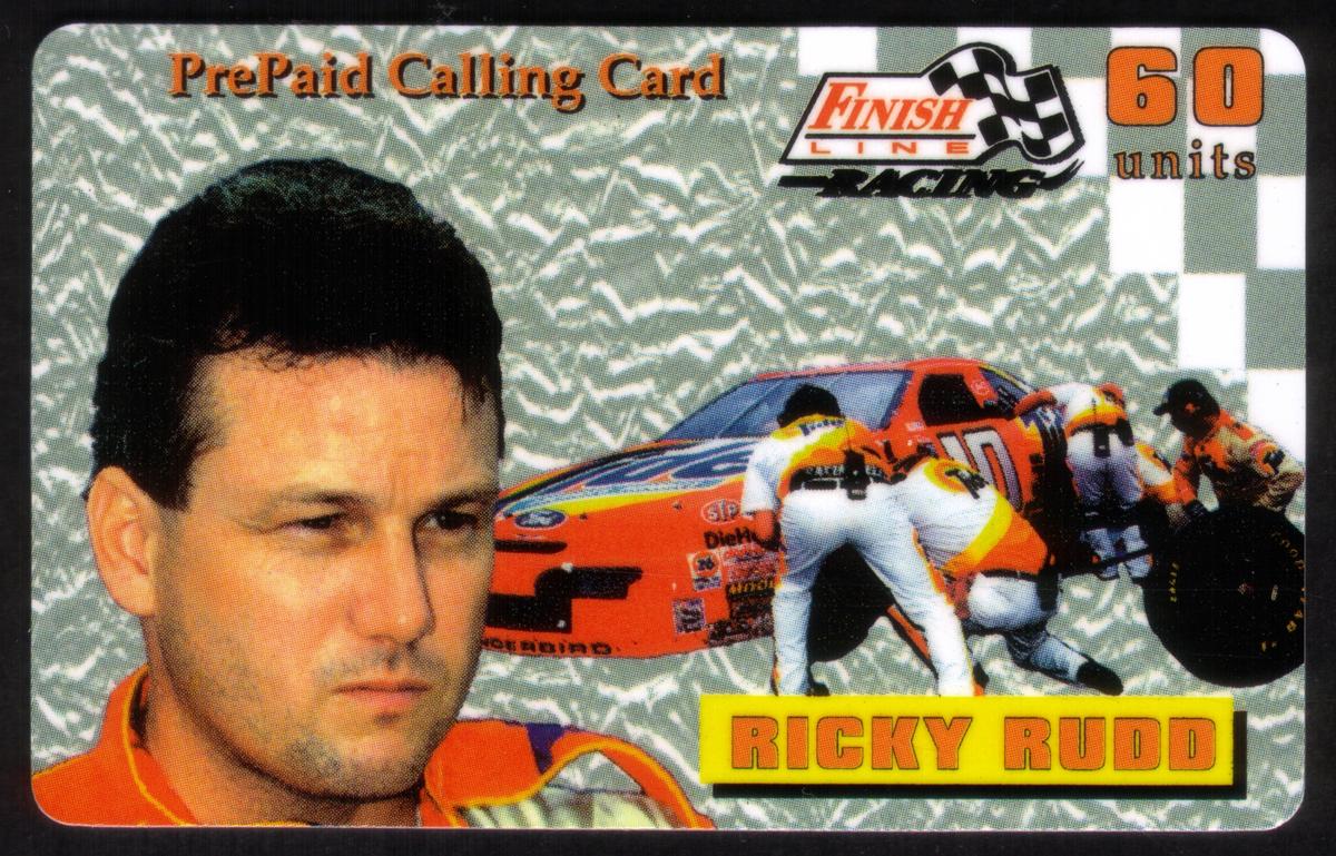 Four NASCAR prepaid cards featuring Ricky Rudd, race car action, pit stop scenes, and bold branding for collectors and racing fans. |