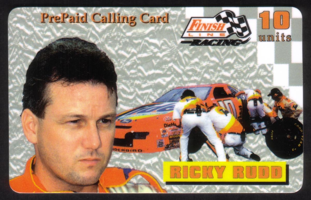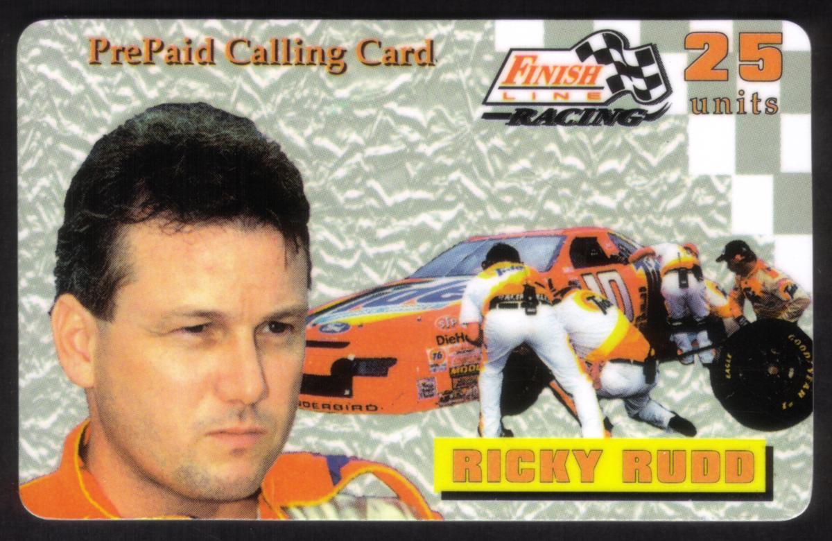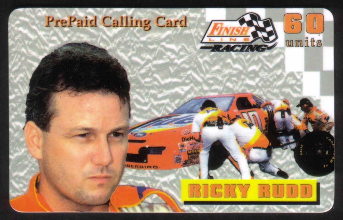 The background of each card has a silver textured pattern, while the top right corner shows the number of calling units available: 5, 10, 25, or 60 units. Above this, the black and white checkered flag logo of Finish Line Racing is featured. Below the car image, Ricky Rudd’s name is presented in bold yellow letters with a red outline. The top left corner of each card includes the text "PrePaid Calling Card" in orange.