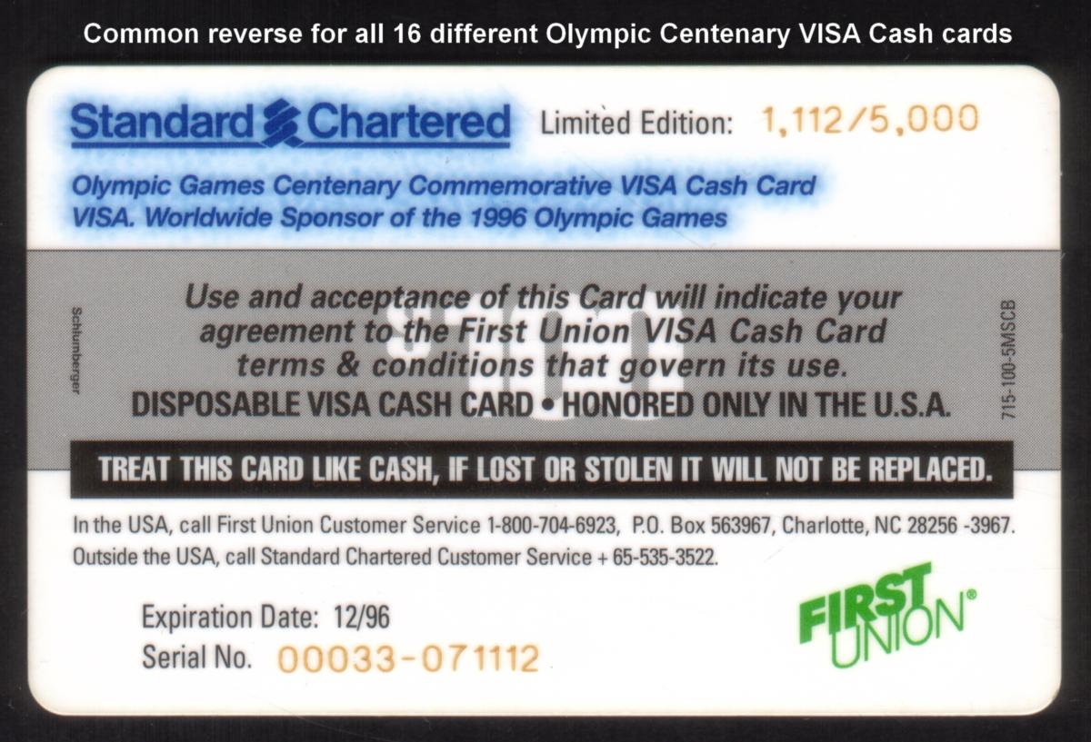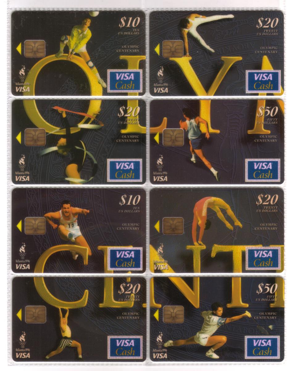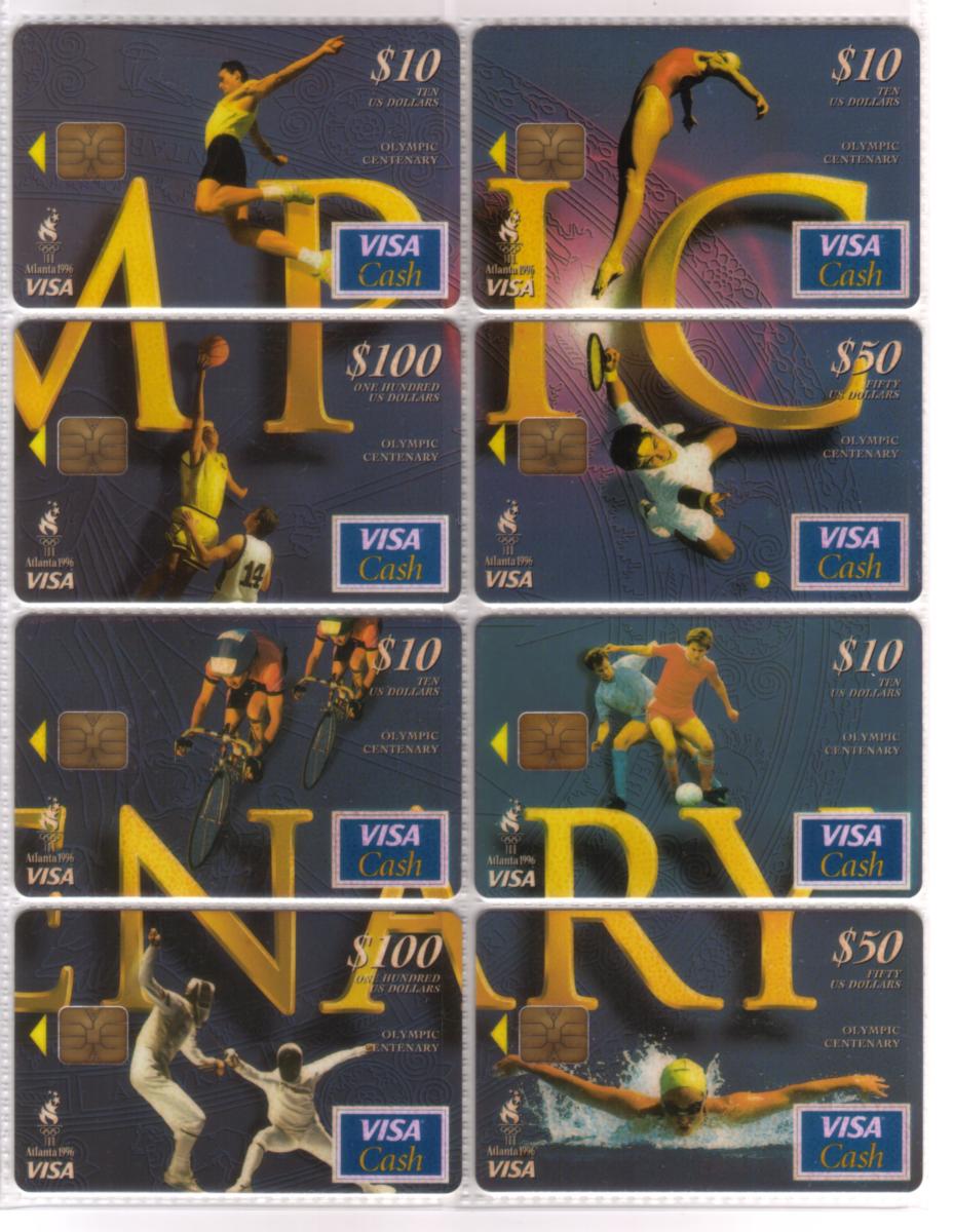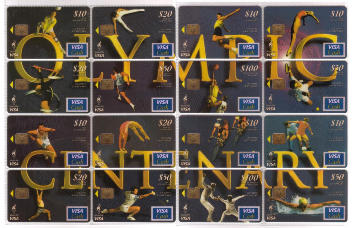 Keywords: setof, chip cards, stored value, smart cards, schlumberger, scv, bank card, chip card, atlanta olympics 1996, standard chartered bank, limited edition, 1996 olympic games centenary commemorative visa cash card, bankcard, First Union Corp. Bank