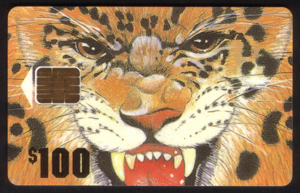 This collectible chip bank card features a close-up illustration of a jaguar’s face, showcasing the animal’s snarling mouth with sharp teeth, detailed fur patterns, and intense eyes. The jaguar’s fur is vividly drawn with characteristic black rosettes on a yellow-orange background, capturing the wild essence of the animal. The chip for banking transactions is embedded near the upper-left corner of the card.