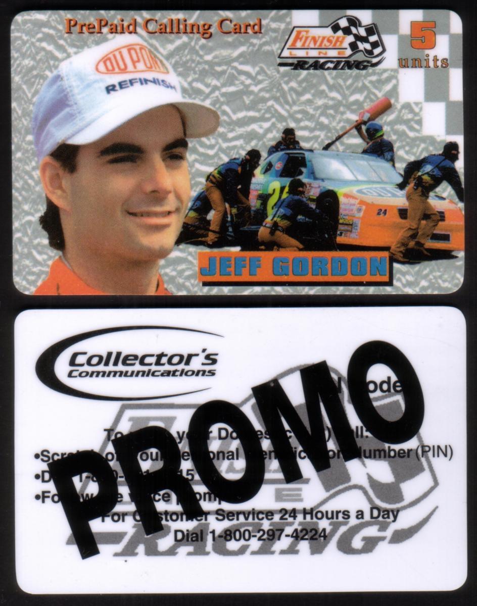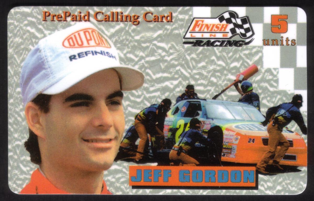 Additional graphic details include the "Finish Line Racing" logo at the top right with a checkered flag design and the text "PrePaid Calling Card" in orange at the upper left. The card denomination "5 units" is displayed in orange at the upper right corner. The name "Jeff Gordon" is prominently printed near the bottom center in bold blue letters with an orange outline. This card is part of the 5u Platinum Series PROMO associated with Jeff Gordon and DuPont, connected to the world of auto racing and NASCAR.
