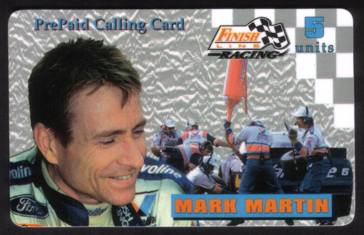 This collectible prepaid calling card features a close-up image of NASCAR driver Mark Martin on the left side, smiling and dressed in his racing suit adorned with Ford and Valvoline logos. The background shows a pit crew in action, servicing a race car during a pit stop. The race car has visible Valvoline and Ford branding on it.