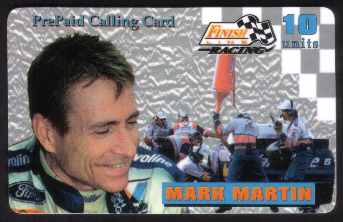 The card’s background has a textured silver-gray pattern. The top left corner displays the text "PrePaid Calling Card." In the top right corner, a logo with a checkered flag and the words "Finish Line Racing" is shown, alongside the denomination "10 units" in blue text. At the bottom right, the name "MARK MARTIN" appears in bold orange letters on a blue rectangle.