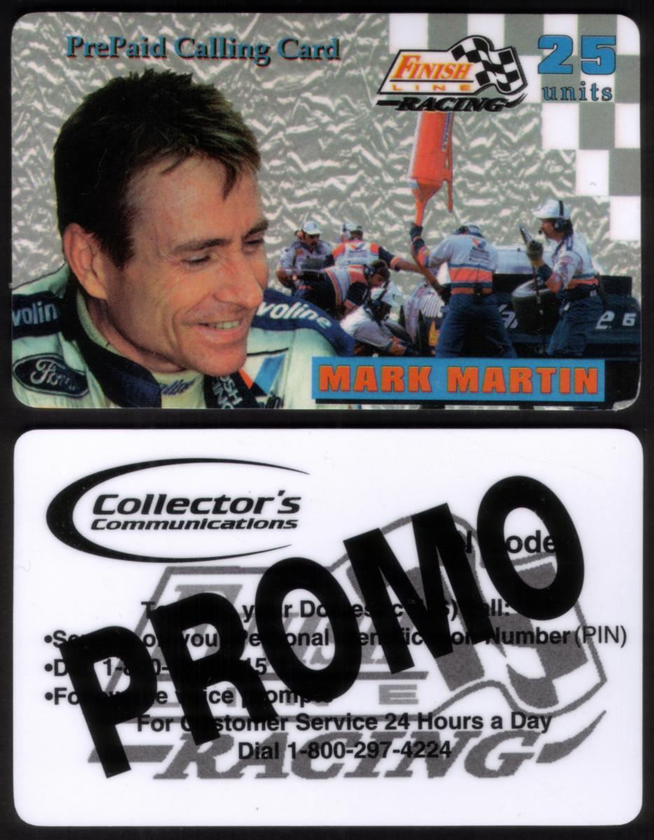This card combines NASCAR racing imagery with corporate trademarks, celebrating Mark Martin’s involvement in auto racing, specifically his connection to the Ford team and Valvoline sponsorship. The prepaid calling card is a sports collectible representing automotive and racing themes.