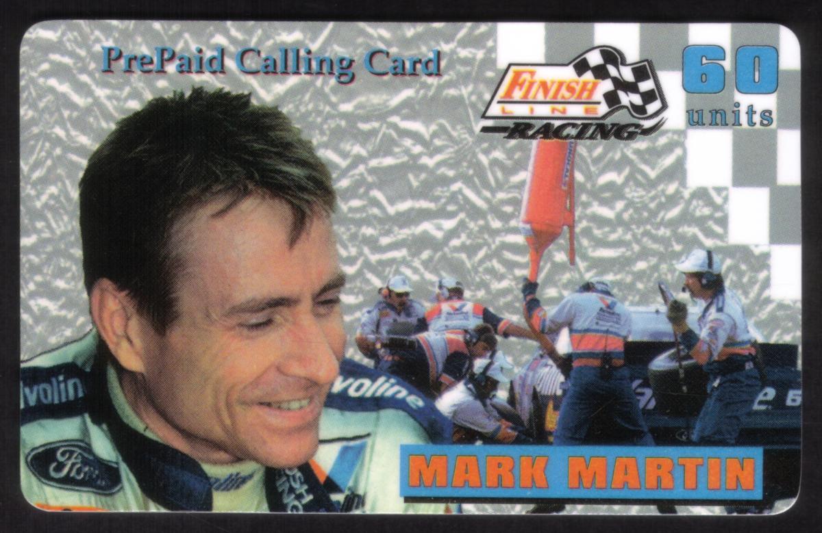 Prepaid calling card featuring NASCAR driver Mark Martin in racing gear with pit stop scene, racing logos, and bold orange name display. |