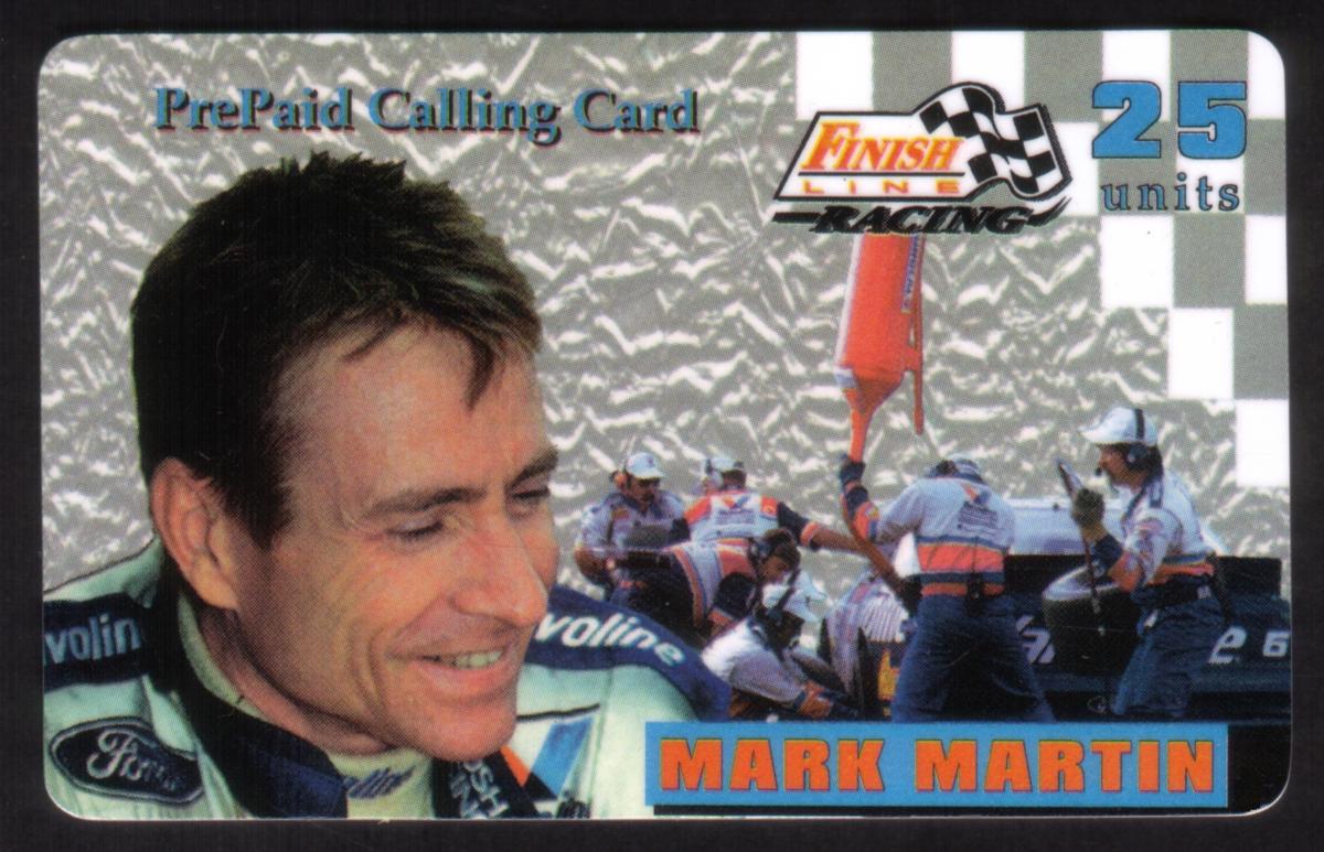 These collectible prepaid calling cards showcase Mark Martin, a well-known NASCAR driver. Each card prominently features a close-up photo of Mark Martin on the left side, smiling and wearing a racing suit adorned with Valvoline and Ford logos. Adjacent to Martin’s image is a dynamic scene from a racing pit stop, highlighting several crew members actively working on a race car under bright lighting.