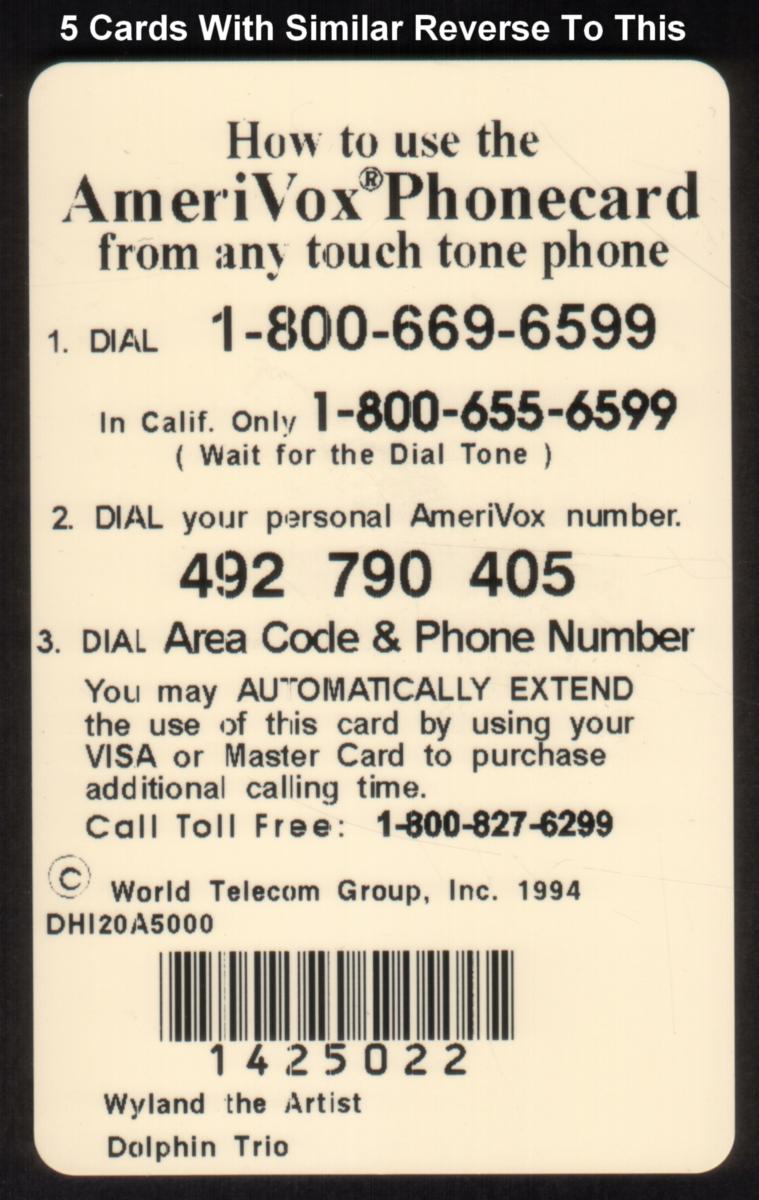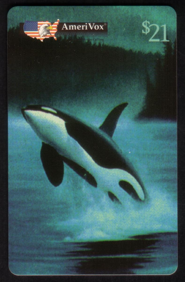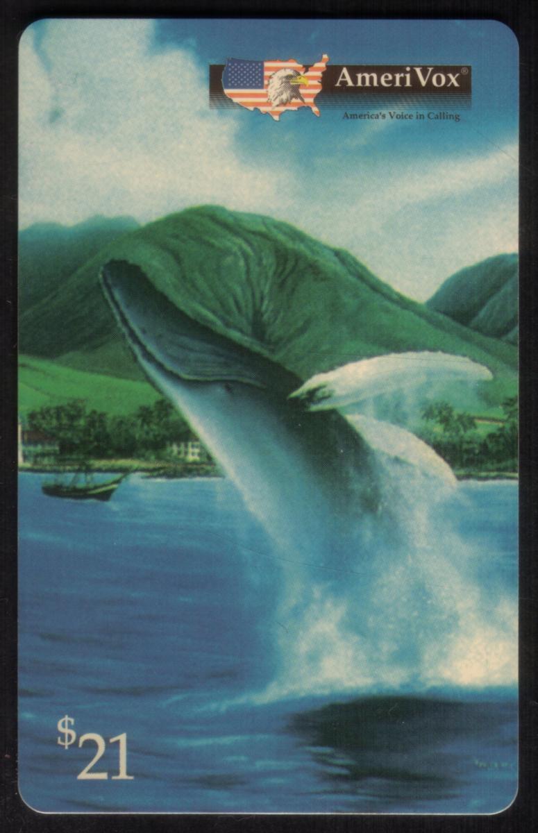 All cards include the AmeriVox logo with an American flag and the phrase "America’s Voice in Calling," reinforcing their usage as phone cards. The consistent $21 denomination is clearly printed on each card front. The artwork showcases Wyland’s signature marine wildlife themes, highlighting whales, dolphins, and oceanic scenes in a naturalistic style. These cards, issued in 1994, combine collectible art with telecommunications utility.
