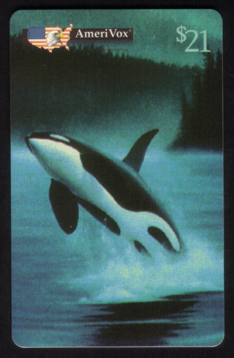 The card has a $21 value printed in the upper right corner in white. In the upper left, there is a small American flag next to an eagle's head graphic, followed by the text "AmeriVox" in white. The text "Phone Card" appears below the AmeriVox name in smaller print. This phone card is part of a nature and wildlife-themed series, spotlighting sea life, specifically whales, and captures a vivid scene from the marine environment.