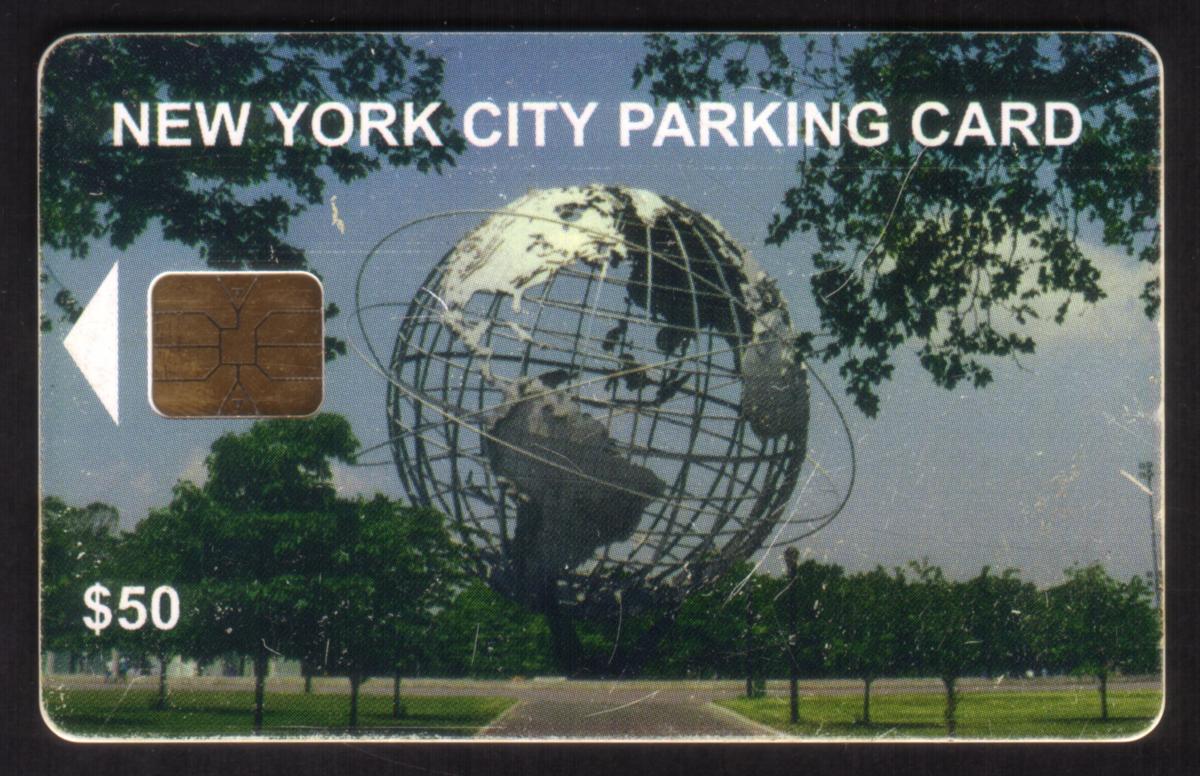 The top of the card clearly states "NEW YORK CITY PARKING CARD" in bold white capital letters. The bottom left corner shows the denomination "$50" in white. To the left of the globe image, a gold-colored chip is embedded in the card, indicating it is a chip-enabled parking card.