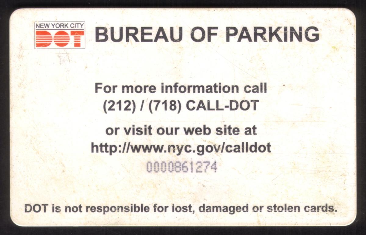 Text on the front of the card connects it to the New York City Department of Transportation (DOT), Bureau of Parking, and associates it specifically with New York City parking services. The overall design effectively merges the functional use of the parking card with a visual representation of New York City through the famous Unisphere landmark.