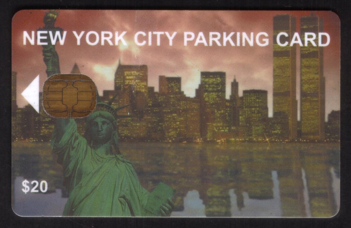 New York City parking card featuring Statue of Liberty, Lower Manhattan skyline, Twin Towers, $20 value, embedded chip, and NYC DOT official details. |