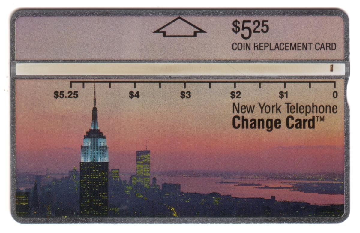 The card has a monetary value marked as $5.25, identified as a coin replacement card for telephone use. Along the upper edge of the card runs a horizontal scale indicating value increments from $0 to $5.25. The text "New York Telephone Change Cardâ„¢" is printed clearly on the right side of the image section.
