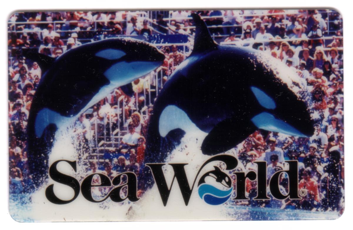 Six SeaWorld collectible cards featuring marine animals like orcas, dolphins, penguins, sea otters, sharks, and orca trainers, showcasing wildlife and performances. |