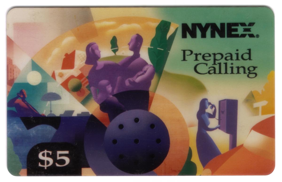 Artistic NYNEX prepaid phone card featuring abstract shapes, human figures, and telecommunication imagery, emphasizing human connection and communication. |