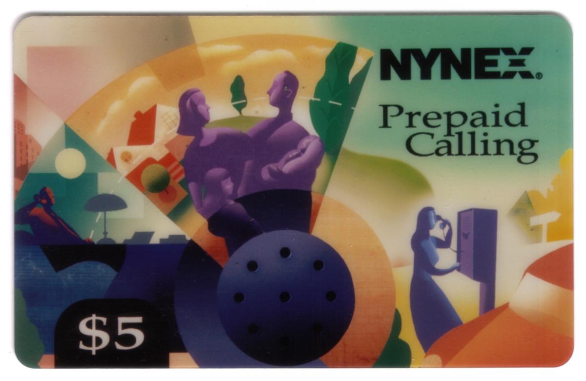 The background incorporates various abstract elements in shades of green, orange, yellow, and blue, including a silhouette of a cityscape with a lamp and buildings on the left side. The bottom left corner shows the white denomination of "$5" prominently displayed in a black rounded rectangle. The top right of the card contains the text "NYNEX" and "Prepaid Calling" in black, clear lettering.