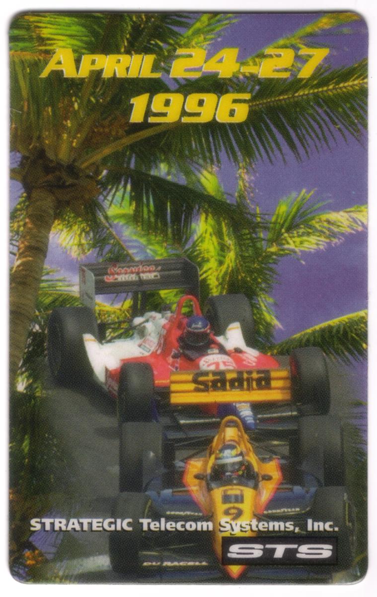 This card is used and was valid until December 3, 1996. It was issued by Strategic Telecom Systems, Inc., and highlights the elements of racing cars connected to the Orlando Florida Convention during the specified dates.