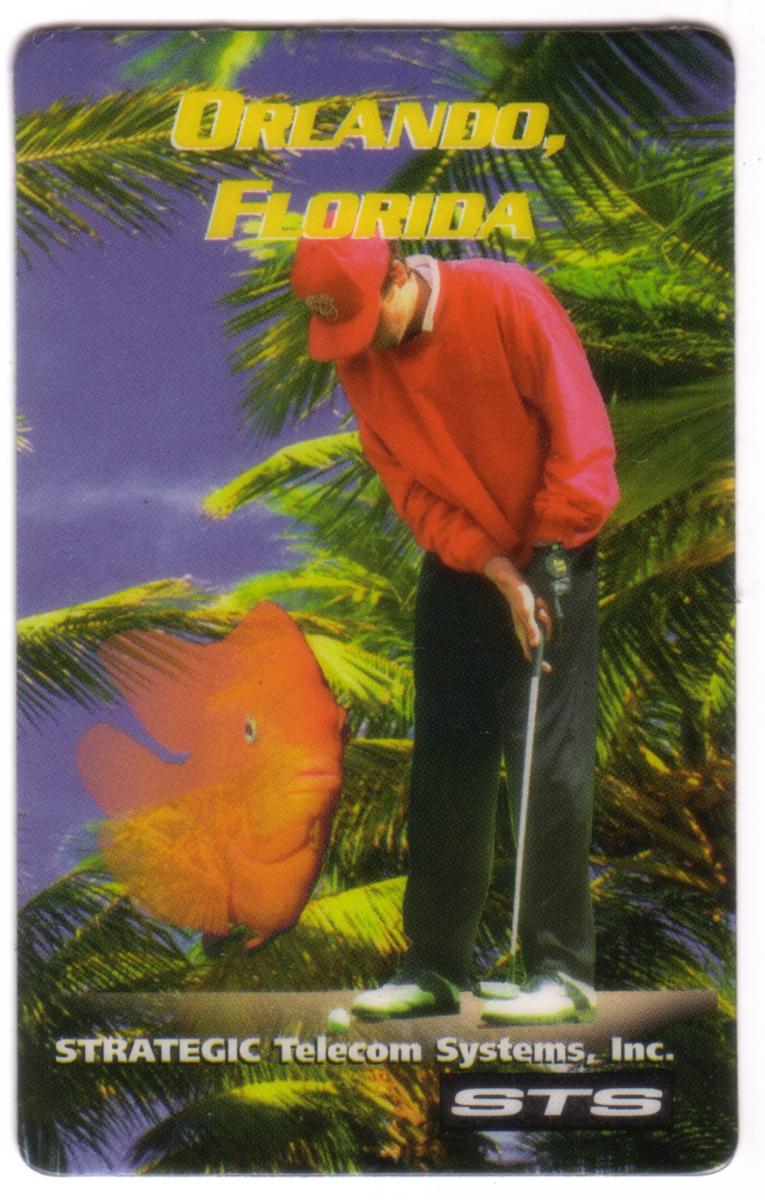 The card prominently displays the yellow text "ORLANDO, FLORIDA" near the top. Below the golfing figure, the white text reads "STRATEGIC Telecom Systems, Inc." with the white STS logo underneath. This card is associated with the 1996 Orlando Florida convention held April 24-27. It is the second edition and the right side card in a puzzle set of three. The subject and theme connect to sports, specifically golf.