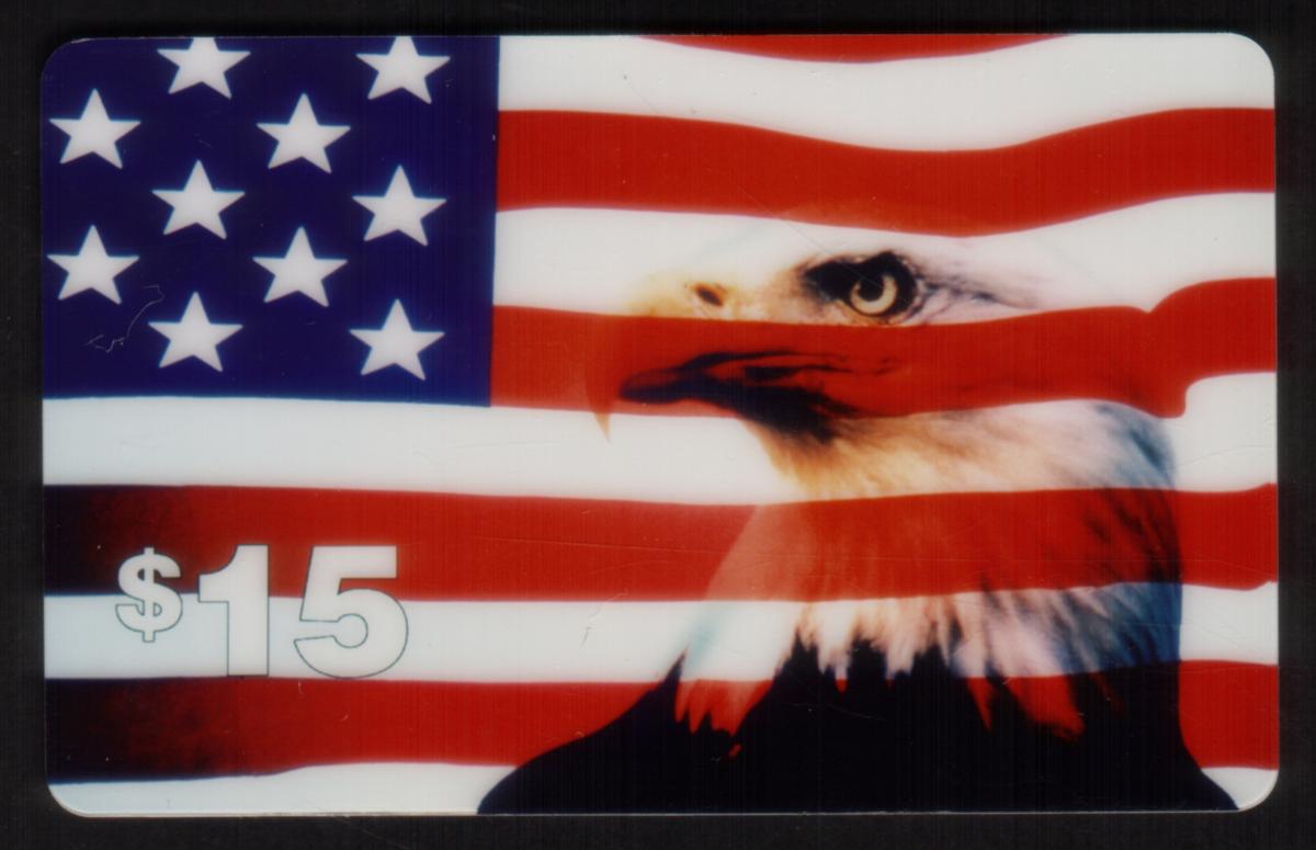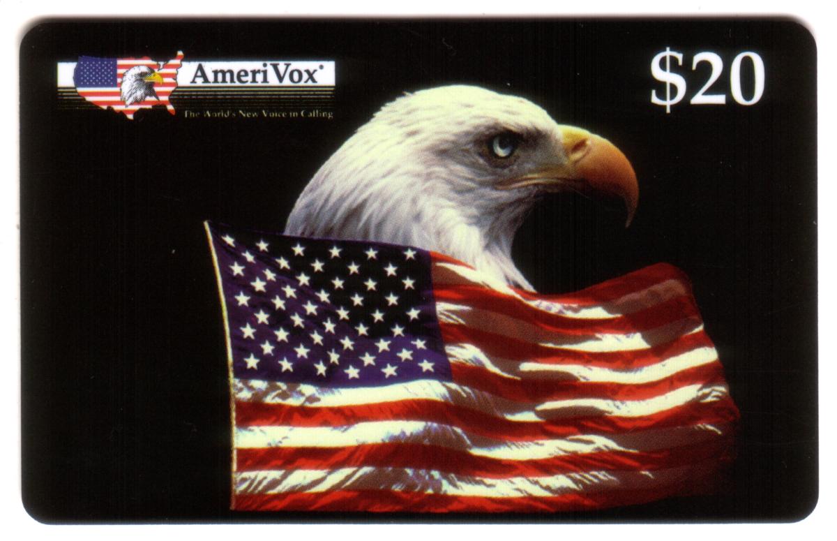 American patriotic phone cards featuring bald eagles and flags, issued by ACMI and AmeriVox, with denominations from $10 to $100, celebrating American symbols. |
