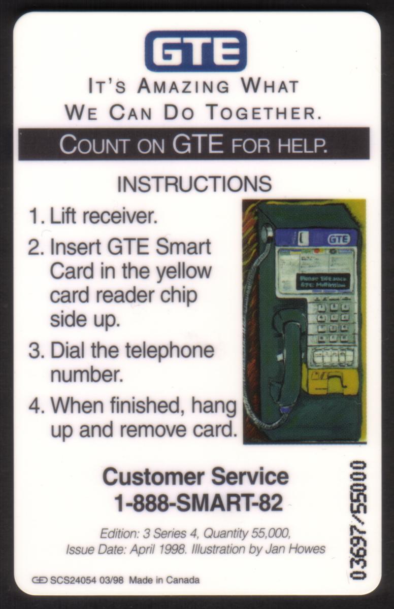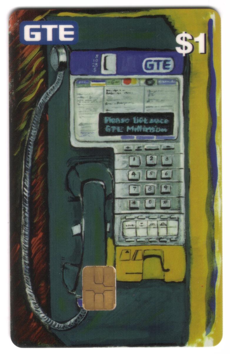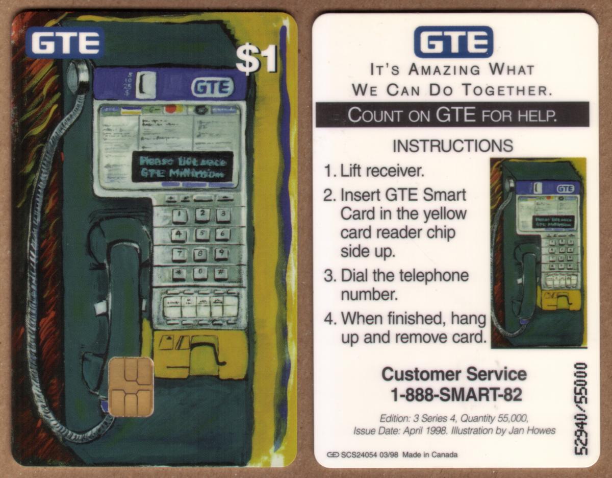 Issued in April 1998 by GTE Communications, this chip card allows users access to phones on GTE payphones. The card’s visual theme emphasizes phone service technology and the GTE brand, reflecting telecommunications of the period.