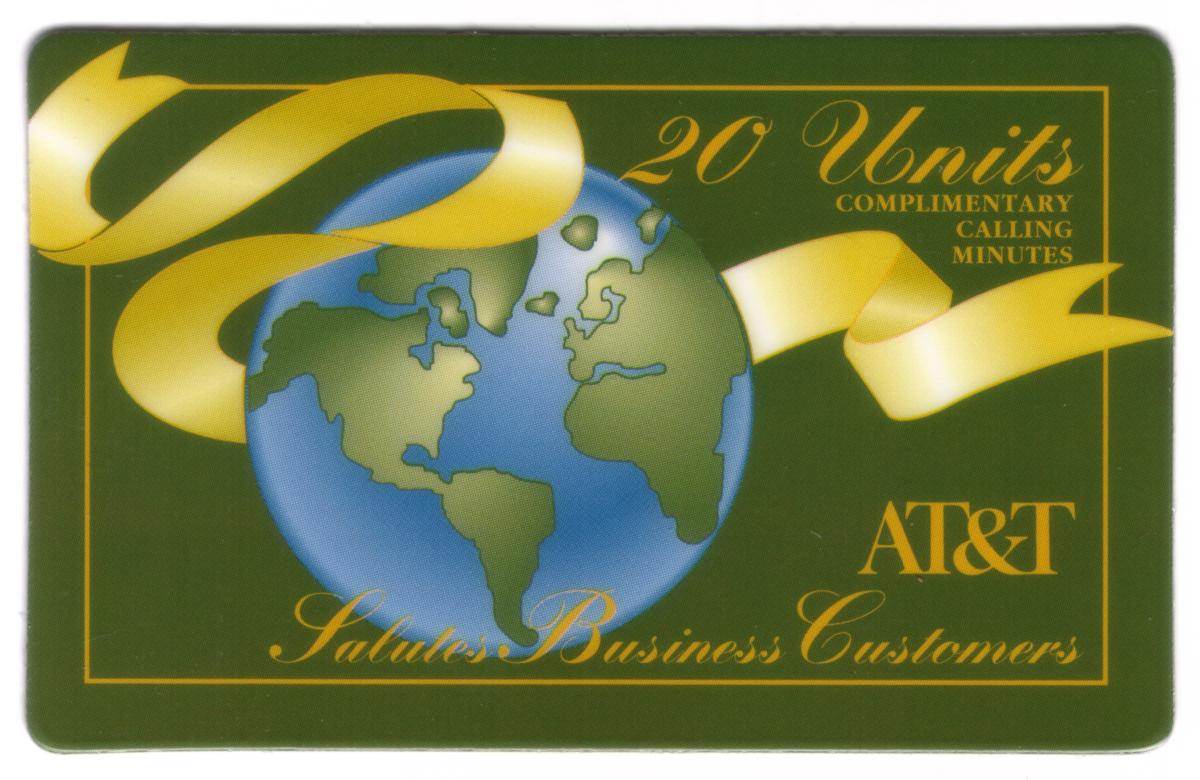This card is promotional in nature, designed to honor AT&T business customers with an allotment of 20 complimentary calling units. The overall style blends corporate branding with a global theme, highlighting AT&T's reach and customer appreciation.