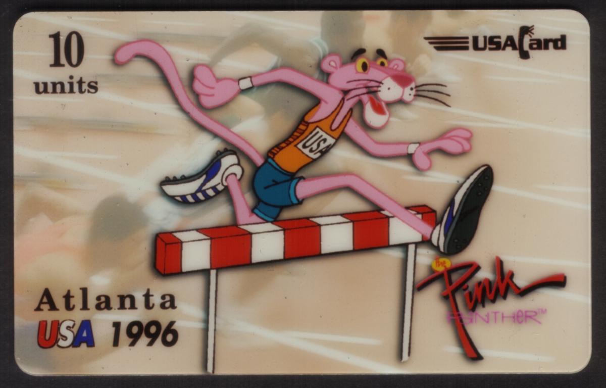 The upper right corner of the card has the USACard logo in black. The card’s overall design is colorful and sporty, capturing both the animation and Olympic running and hurdling themes associated with the 1996 Atlanta Games.