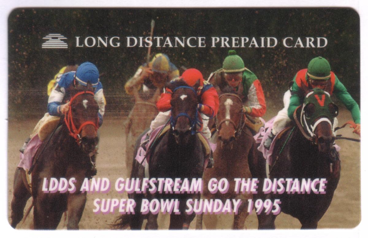 At the top of the card, the text "LONG DISTANCE PREPAID CARD" is printed in white capital letters. Across the lower portion of the card, the phrase "LDDS AND GULFSTREAM GO THE DISTANCE SUPER BOWL SUNDAY 1995" is prominently displayed in pink capital letters. This indicates the card commemorates a special event held at Gulfstream Racetrack in Florida, associated with the LDDS and Gulfstream horseracing promotion on Super Bowl Sunday in 1995.