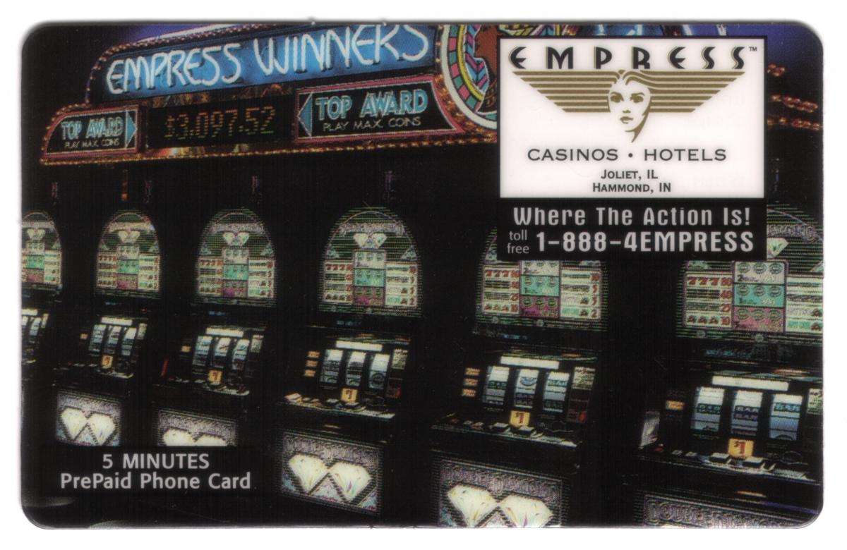 This collectible prepaid phone card features imagery related to Empress Casinos and Hotels, highlighting locations in Joliet, Illinois, and Hammond, Indiana. The main design shows a row of classic slot machines with visible payout amounts, framed by a marquee that reads "EMPRESS WINNERS" along with a large jackpot total of $3,097.52 and a "TOP AWARD" message indicating "PLAY MAX COINS." The phone card offers 5 minutes of prepaid call time and has a toll-free number prominently displayed as 1-888-4EMPRESS.
