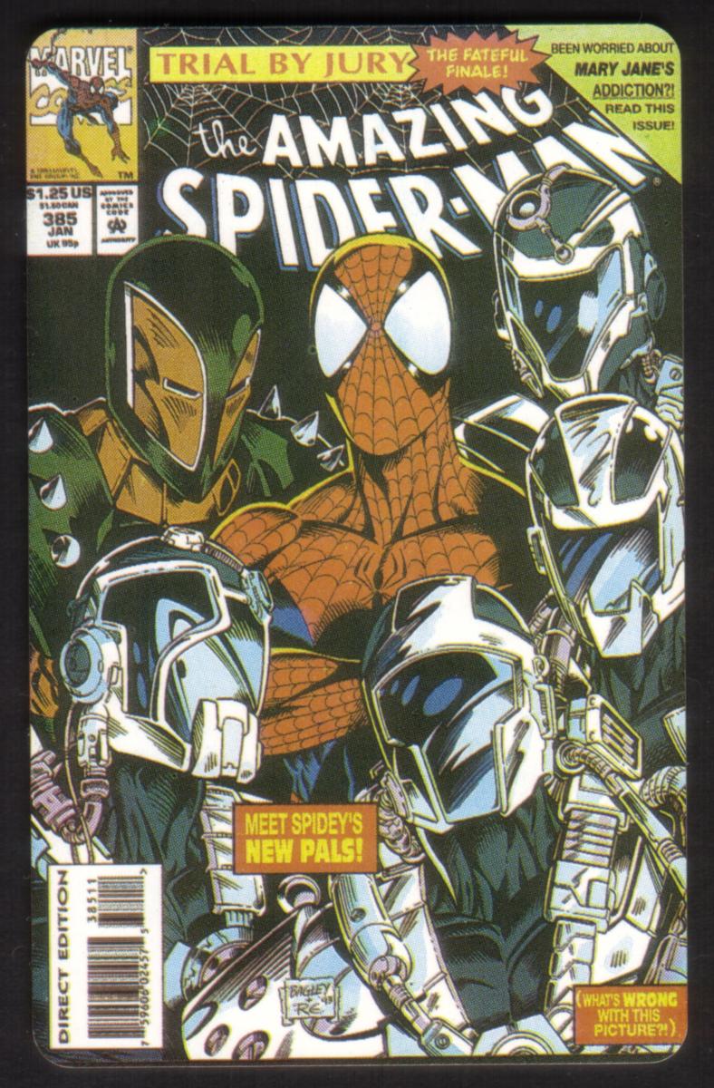 This collectible phone card features the cover art of Marvel Comics' "The Amazing Spider-Man" issue #385. The central figure is Spider-Man in his classic red and blue costume with webbing design, prominently positioned among four armored characters known as the Jury. These armored figures wear helmets and body armor with metallic and dark color schemes, standing close to Spider-Man. The card captures the dynamic comic book style of this cover.