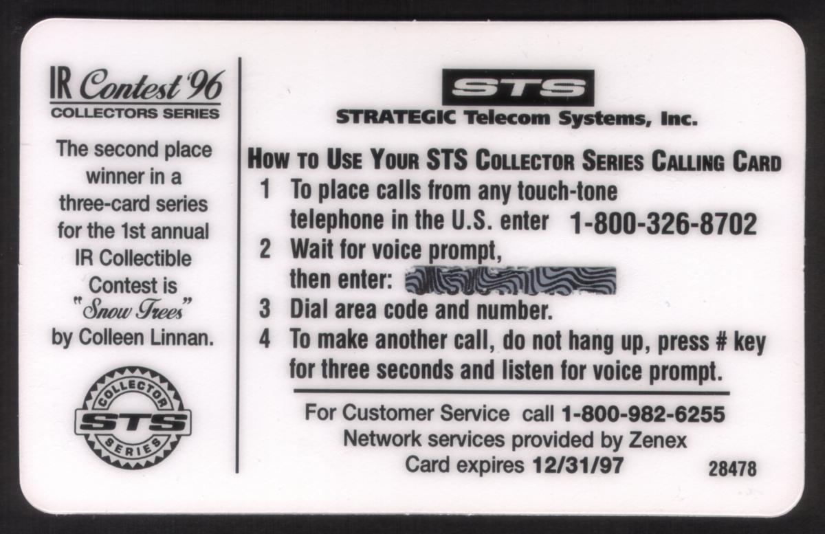 This card commemorates the 1st Annual IR Collectible Contest where it achieved second place. The winning artwork is credited to Colleen Linnan and is titled "Snow Trees." The card recognizes Zenex and Strategic Telecom Systems, Inc. as participating entities in this contest.