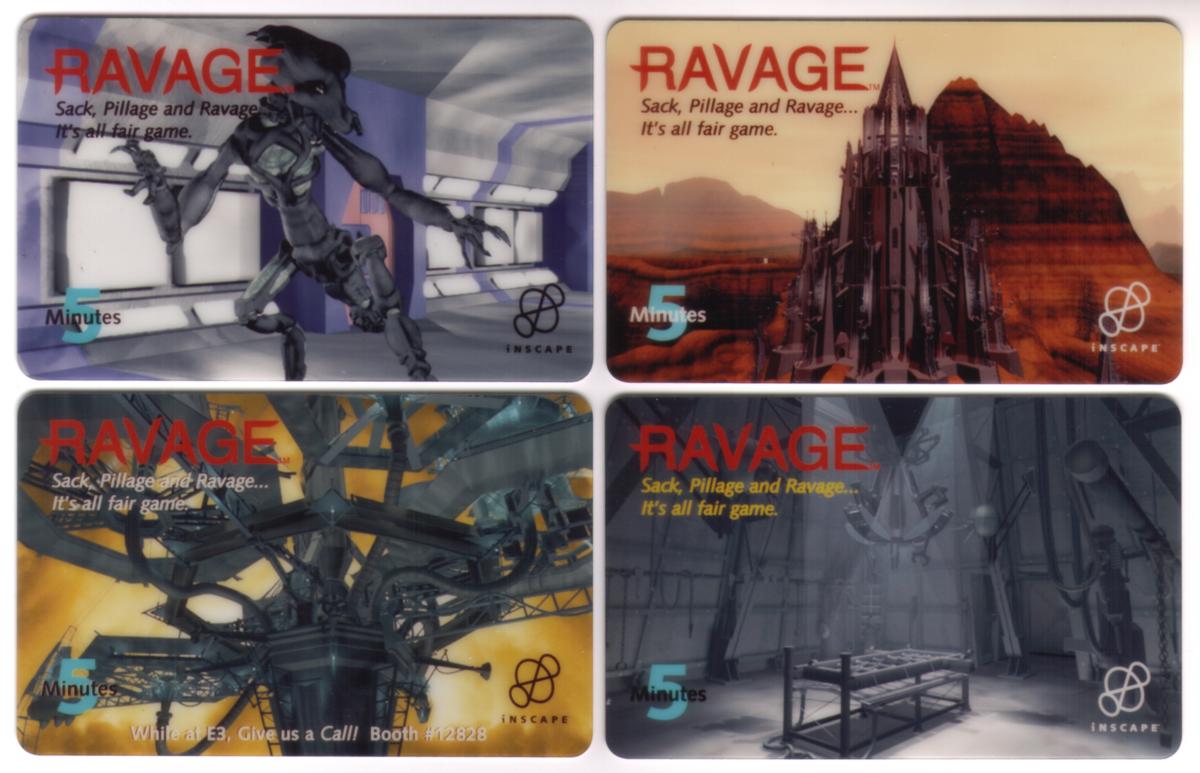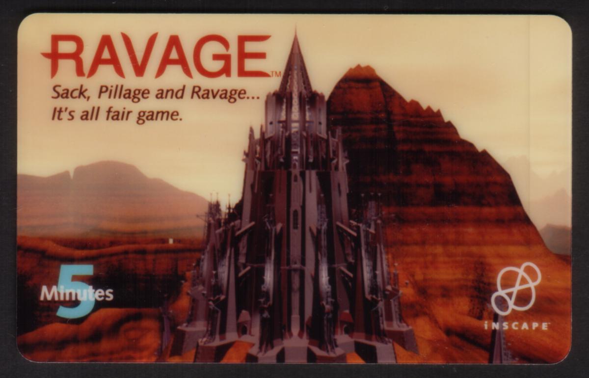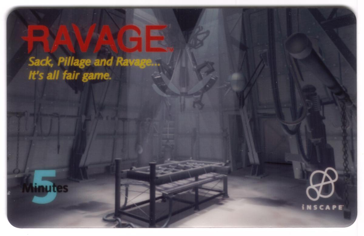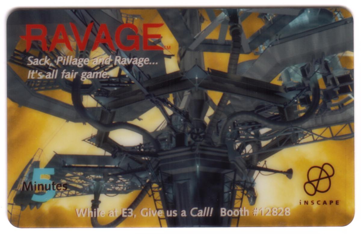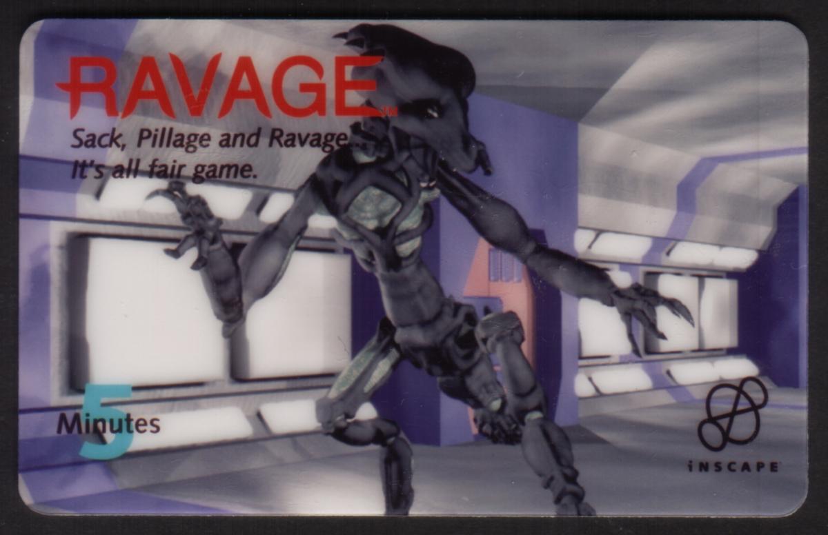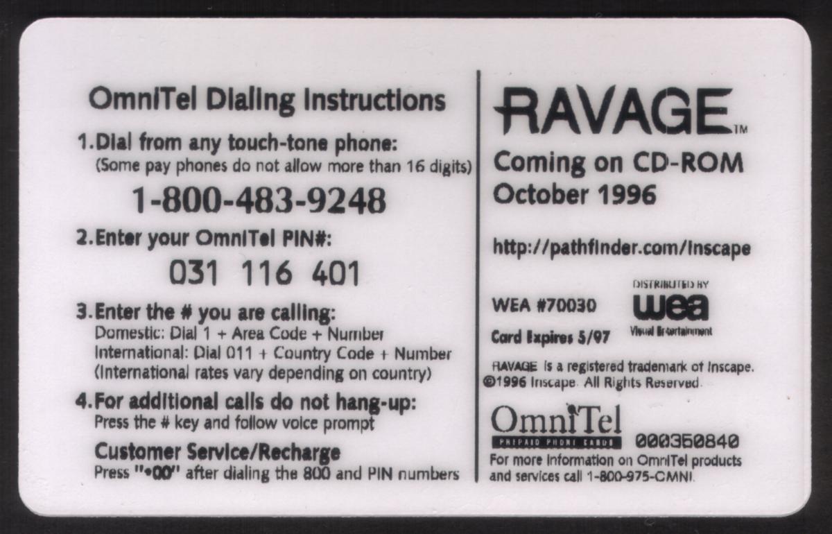 The card includes text indicating it is a “5m Ravage CD-ROM Game Promo,” indicating it was used as a promotional item for the CD-ROM version of the game. The bottom area of the card bears the logos and company names: "WEA Visual Entertainment" and "Inscape," the developers and distributors associated with the game’s release. Additionally, the word “OmniTel” appears on the card, linking it to the promotional distribution channel.