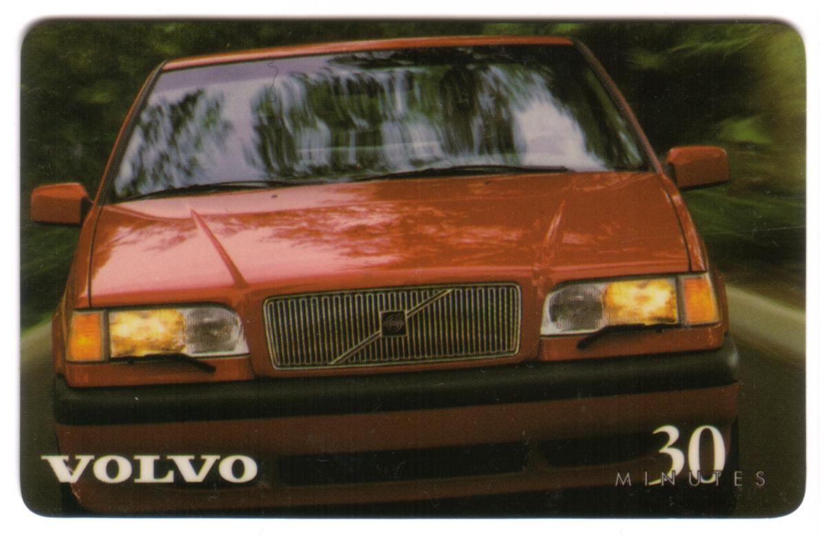 This collectible phone card features a front image of a red Volvo automobile driving on a road surrounded by greenery. The car is captured head-on with clear details of its front grille, headlights, and side mirrors visible. The Volvo logo appears prominently on the front grille of the vehicle.