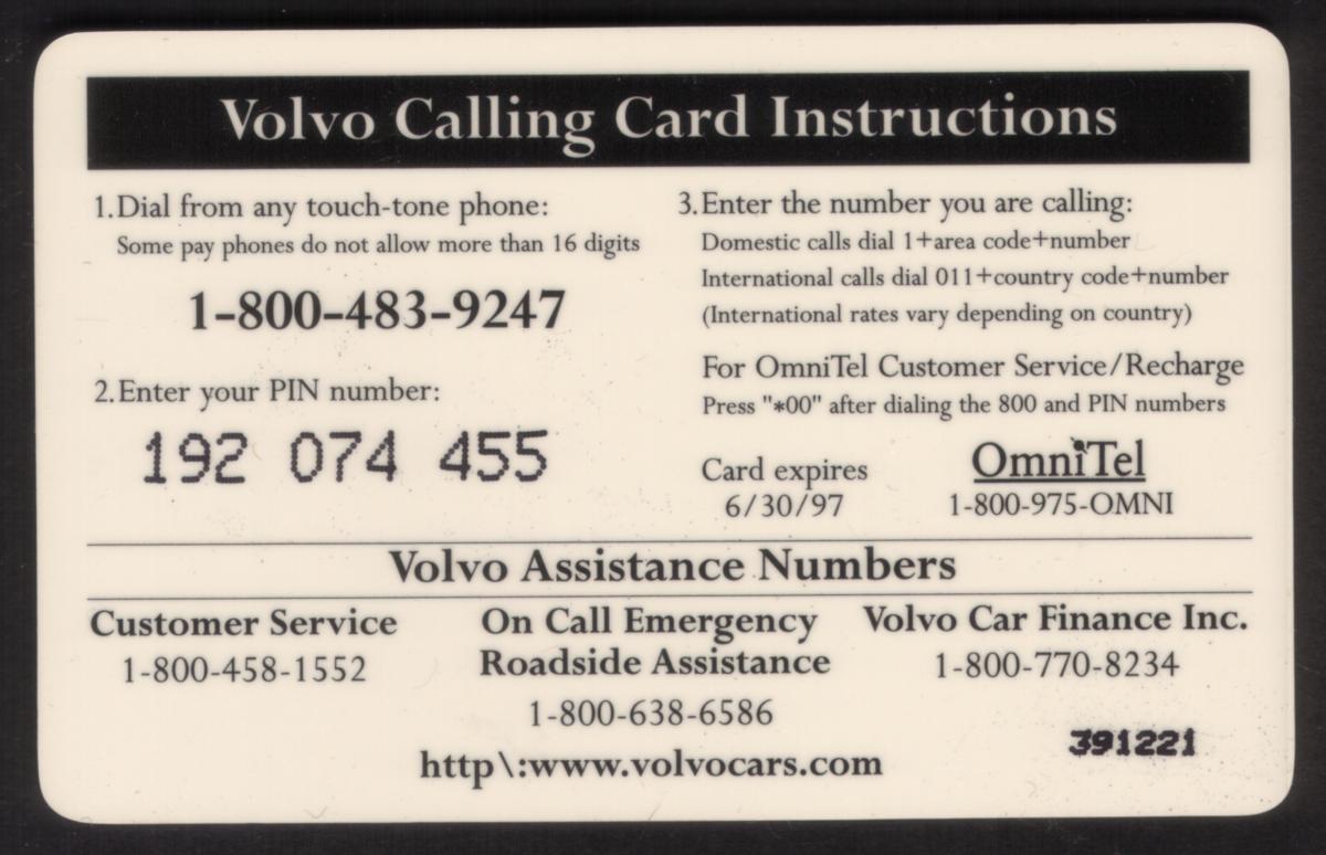 This card appears to be associated with Volvo Auto Assistance and OmniTel, as indicated by the keywords. It highlights Volvo's corporate trademarks and branding, emphasizing transportation services and on-call support for automobile customers.