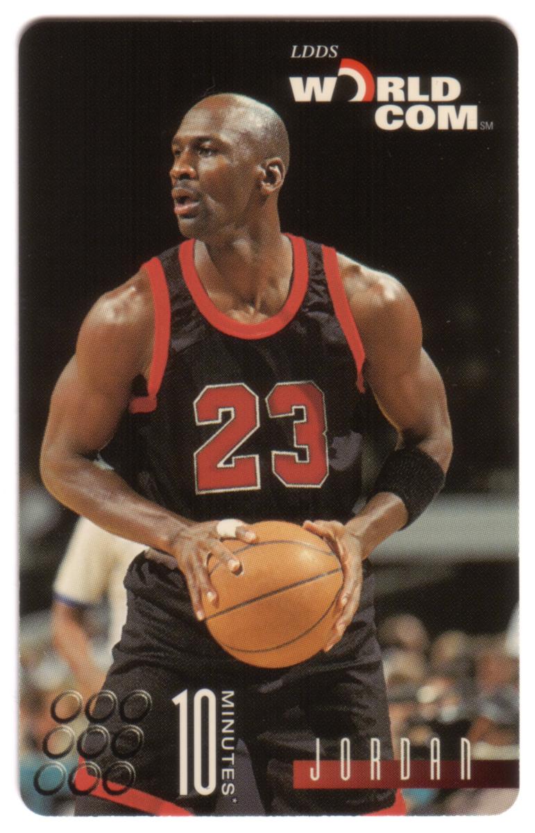 The top right corner of the card displays the LDDS WorldCom logo in white and orange text. On the lower left portion, there is a vertical "10 MINUTES" marking, indicating the card's usage time. The lower right side has the name "JORDAN" in white capital letters. The black and red uniform suggests it is associated with Michael Jordan’s iconic Chicago Bulls team colors.