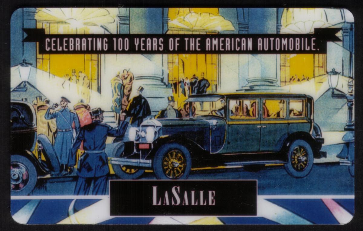 The second card features a detailed illustration of a vintage LaSalle automobile parked in front of a grand architectural structure with tall pillars illuminated by warm yellow lighting. Several people and valet attendants surround the car, dressed in period attire suggestive of the early 20th century. The LaSalle is painted in dark green with black fenders and gold wheels. The card has a black strip at the top that reads "Celebrating 100 Years of the American Automobile" and a centered black box near the bottom with the name "LaSalle" in white letters.