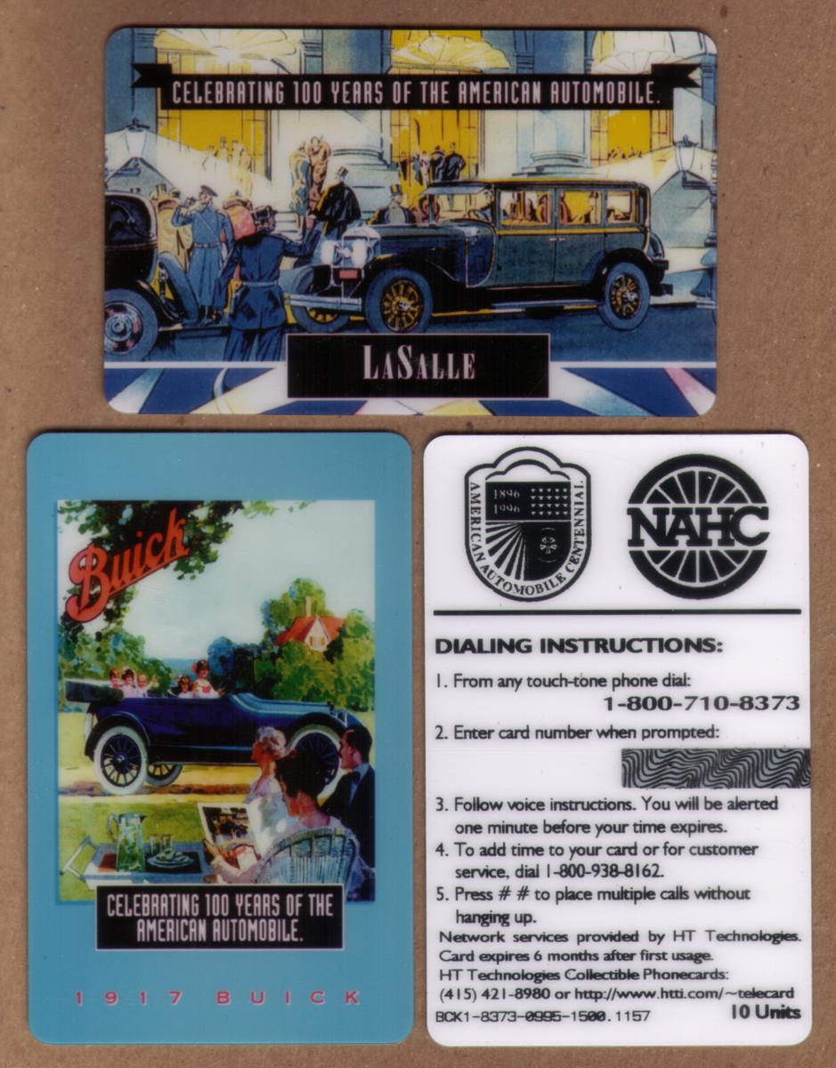 These collectible phone cards celebrate 100 years of the American automobile, featuring classic car imagery from Buick and LaSalle. The first card displays a vibrant outdoor scene with a 1917 Buick automobile in dark color. In the background, a group of people is riding in the open-top Buick, enjoying the countryside with green foliage and a house with a red roof visible. In the foreground, two adults are seated and appear engaged with the scene, adding a nostalgic, leisurely atmosphere. The word "Buick" is prominently displayed in a red cursive font at the top left, and "1917 Buick" is printed in red text along the bottom. A black banner at the lower middle states "Celebrating 100 Years of the American Automobile."