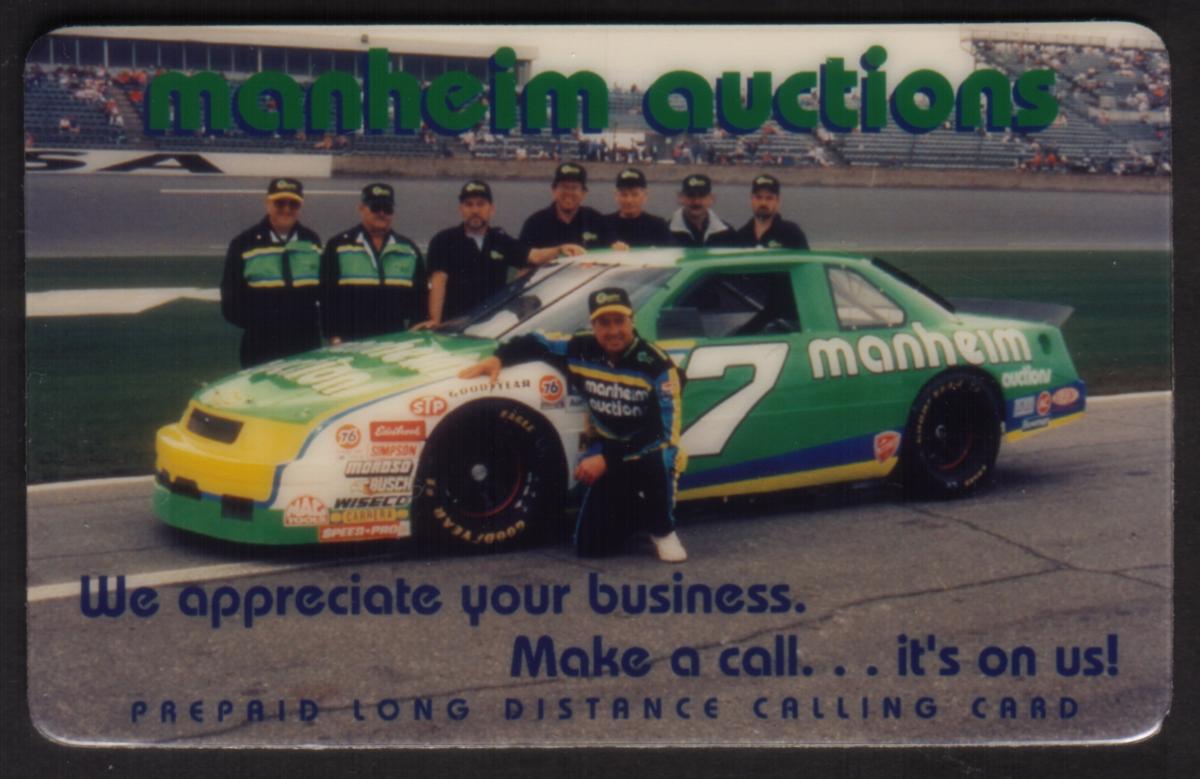 This card is associated with Manheim Auctions from California and highlights their connection to NASCAR and automobile transportation through sponsorship of the #7 car. The card also features branding elements from Goodyear, STP, and 76, companies commonly linked with motorsports, underscoring the racing theme and promotional nature of this collectible calling card.