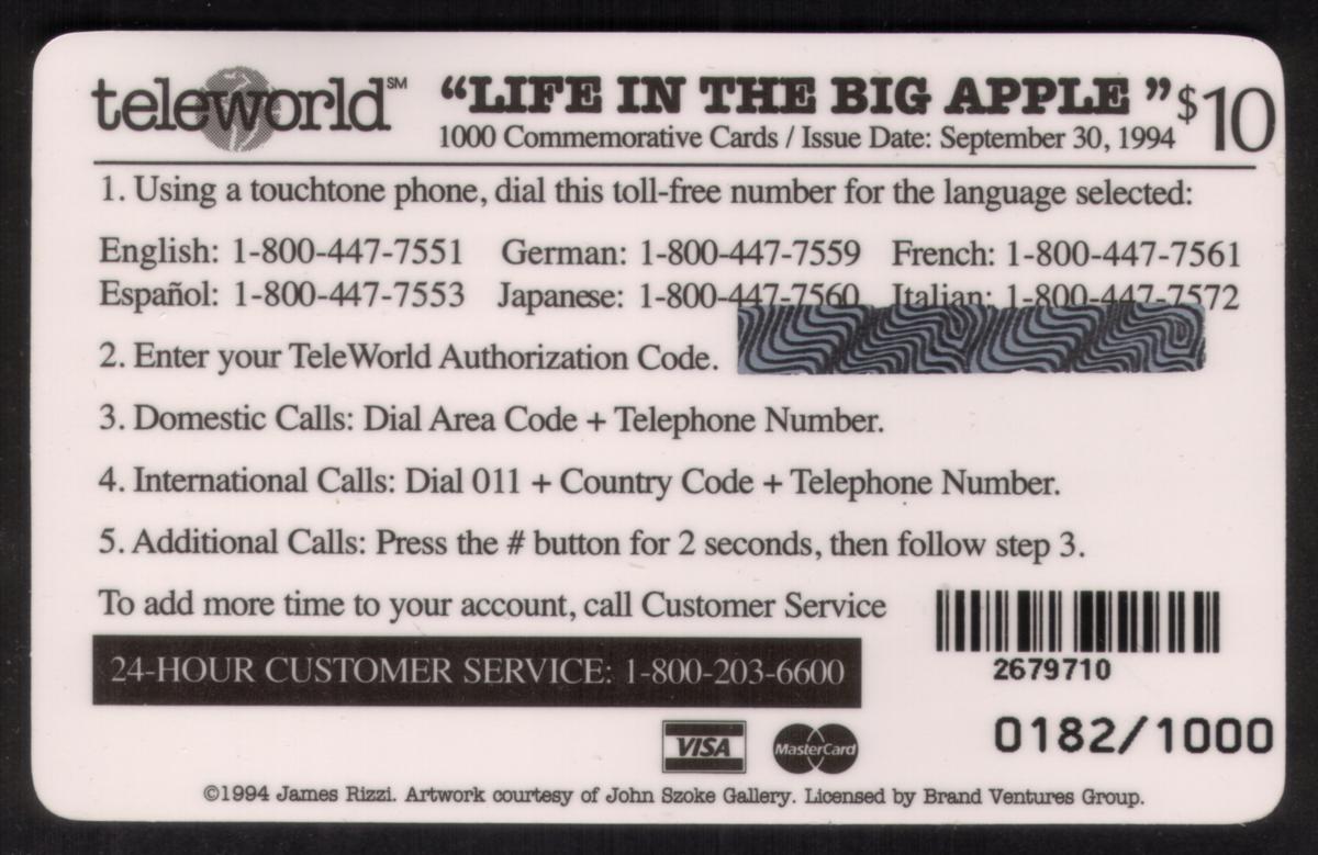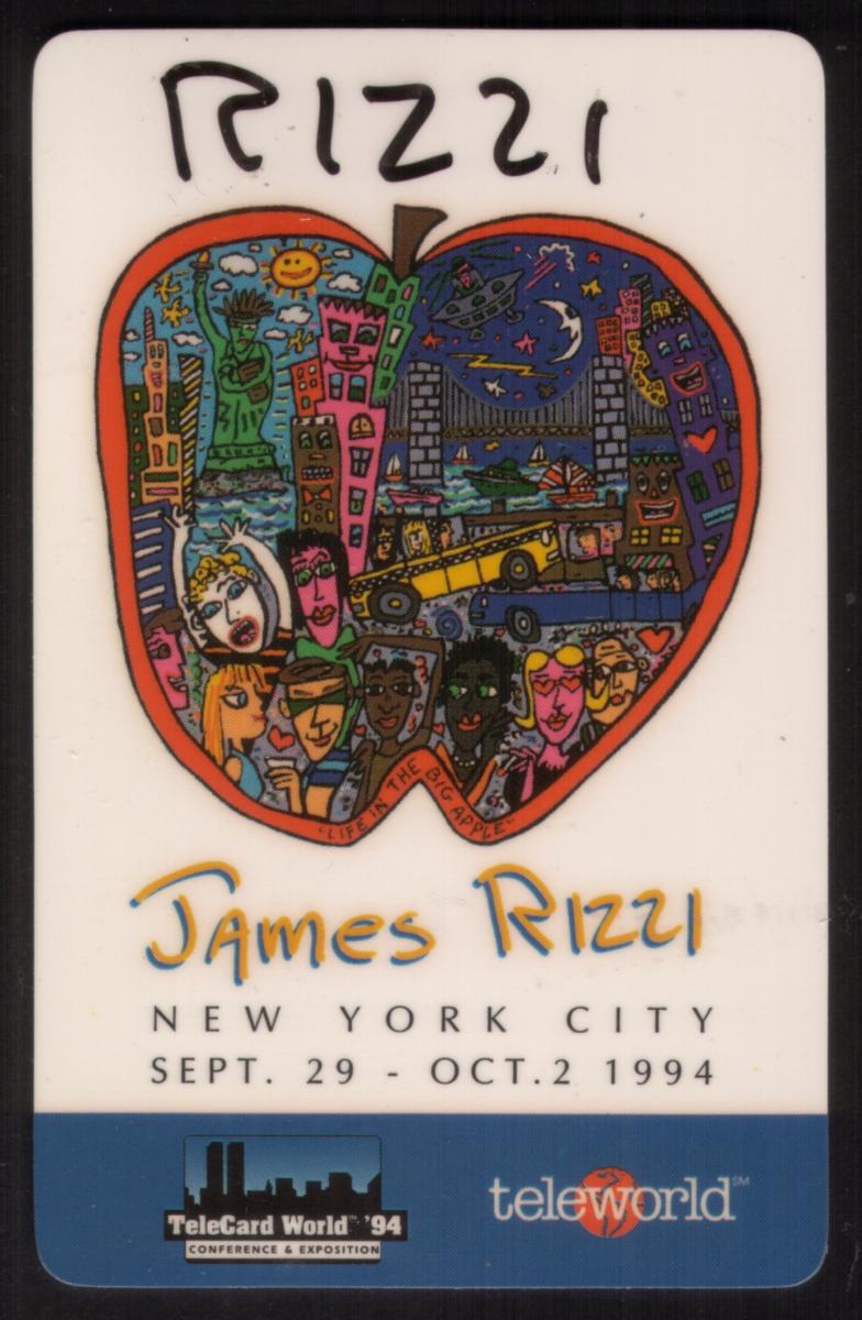 This card commemorates the Teleworld International event held in 1994, celebrating urban life and transportation in New York City through James Rizzi’s distinctive artistic vision. The imagery reflects the lively energy of the city with vibrant colors and detailed scenes packed into the apple centerpiece.