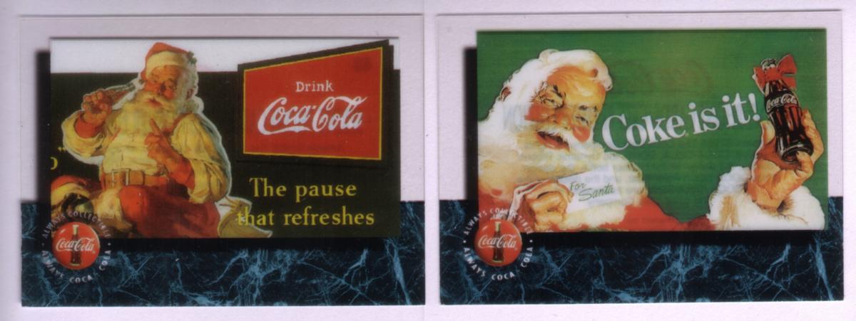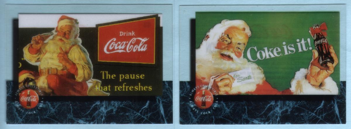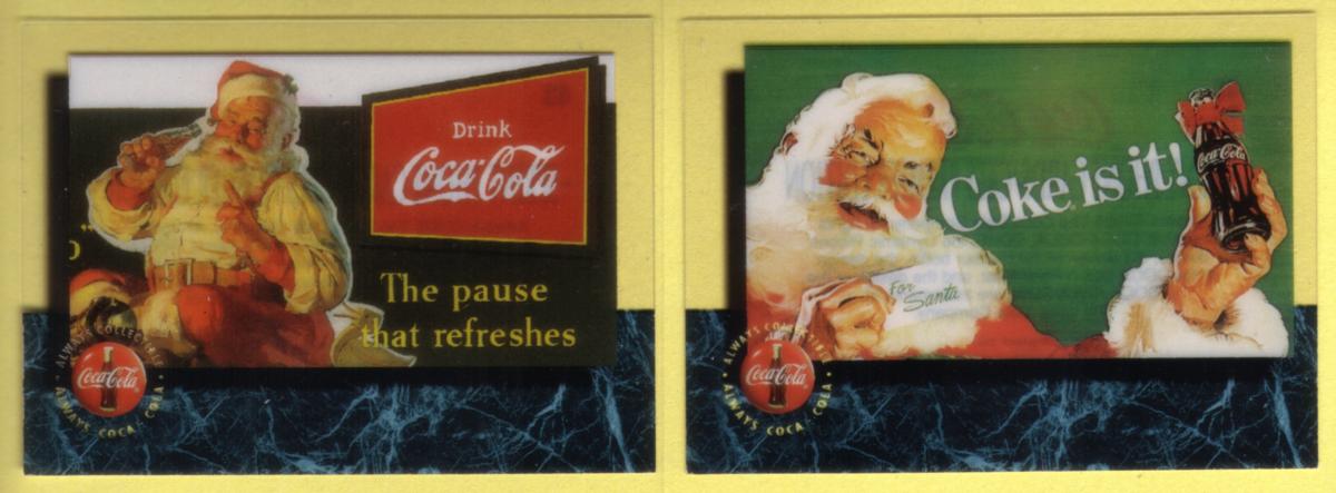 These cards are clearly linked to the Christmas season and Coca-Cola’s long-running association with Santa Claus and holiday advertising. The imagery reflects the "Coke is it!" campaign and the festive spirit of the 1995 Coca-Cola CEL 1 Premier Edition set, capturing iconic Coke bottles, logos, Christmas themes, and the vintage Santa figure synonymous with Coca-Cola memorabilia.