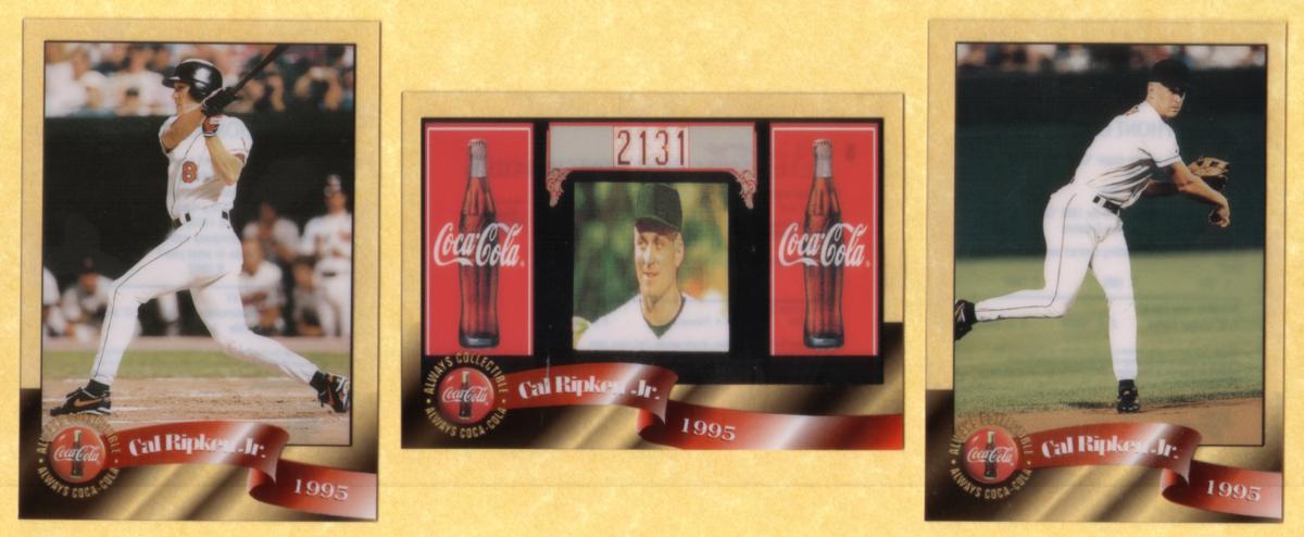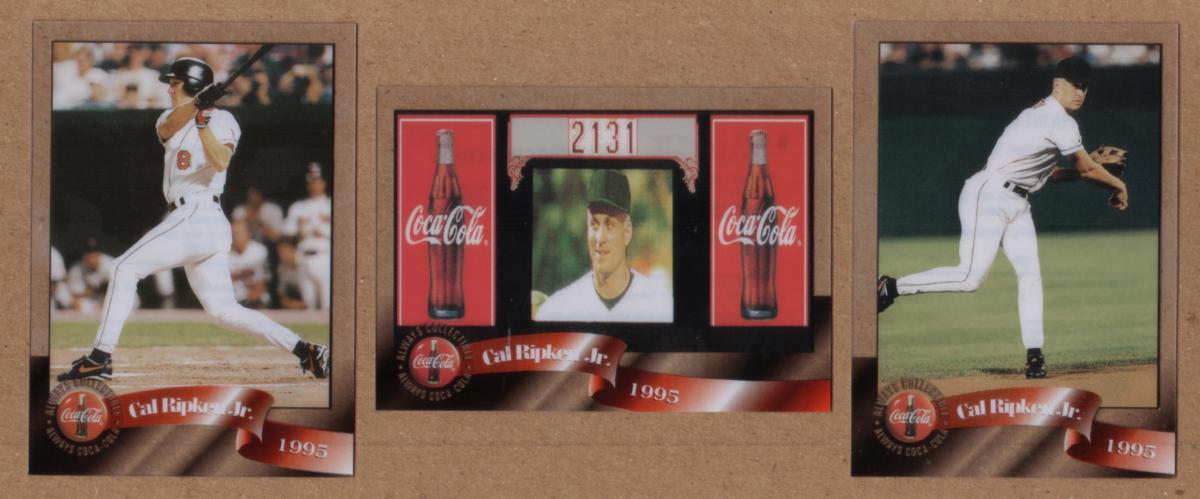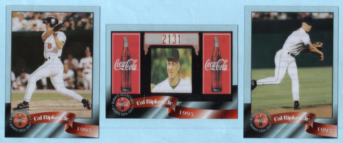 This set prominently showcases Coca-Cola logos and Coca-Cola bottle imagery, connecting the baseball theme with Coke's advertising style. The overall presentation merges iconic sports photography with classic Coke branding, making this collectible notable for fans of Cal Ripken Jr., baseball memorabilia, and Coca-Cola promotional items from the mid-1990s.