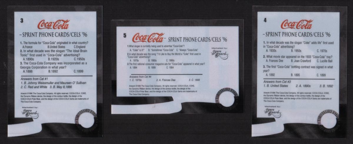 On either side of the central Coca-Cola cel, there are two action images of Cal Ripken Jr. in full baseball uniform. The left card captures Ripken in the midst of a swing, demonstrating his batting stance, while the right card shows him in a pitching or throwing motion. Each of these cards also features the red ribbon banner with his name and the year "1996" at the bottom. A small round logo indicating "Cal Ripken Jr." and "Coke" memorabilia appears at the lower left corner of each action card.