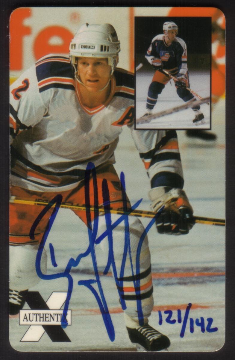 The card bears a bold blue autograph by Brian Leetch across the front with the number "121/142" handwritten near the lower right corner, indicating it is a limited edition signed and numbered original autograph. The bottom left corner includes an "Authentix" logo, verifying the authenticity of the signature. This card is part of a limited production series with only 1,000 preview phone cards made, of which 142 are signed and numbered.