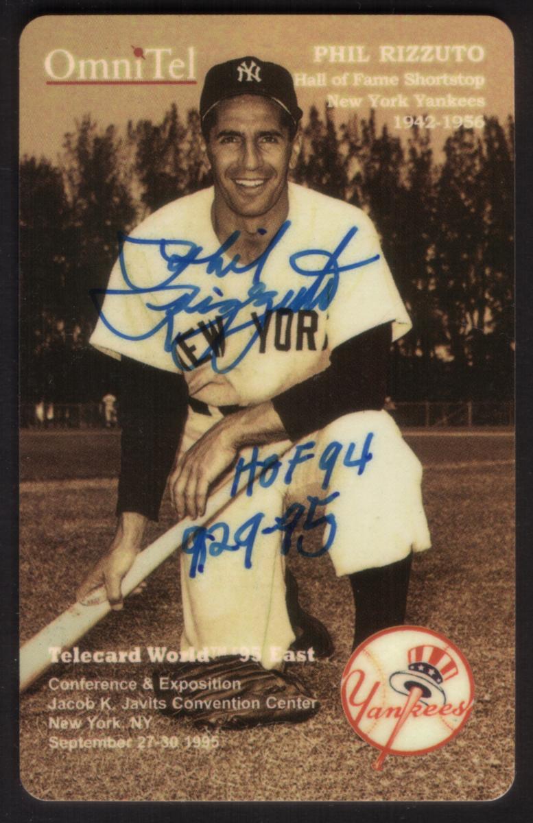 This phone card is a promotional sports collectible linked to baseball and the New York Yankees, celebrating Phil Rizzuto’s legacy and his recognition as a Hall of Fame player. The card’s presentation ties it to a significant sports and collectors’ event, making it a notable item for fans and memorabilia collectors.