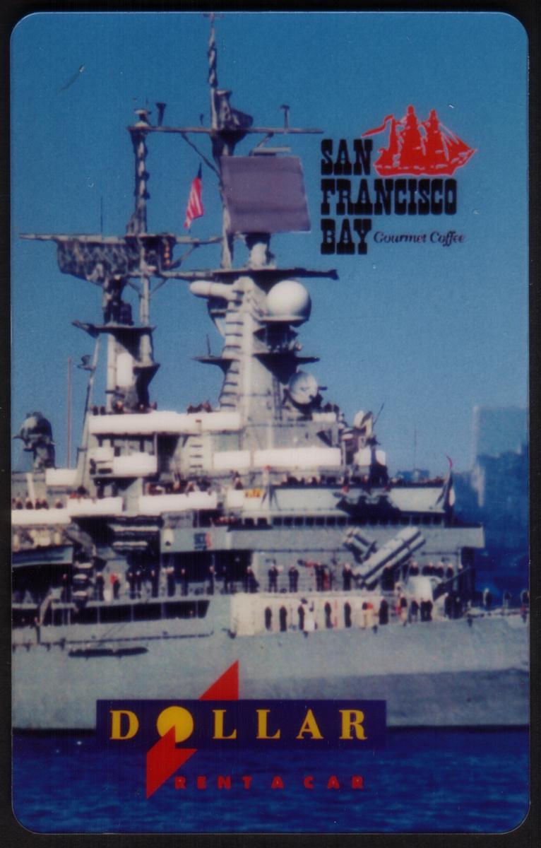 The first card displays a detailed view of a battle ship in San Francisco Bay, with the text "SAN FRANCISCO BAY Gourmet Coffee" in the top right corner, alongside a red logo of a sailing ship. The phrase "DOLLAR RENT A CAR" appears prominently at the bottom center in bold letters with a yellow and red design. The clear blue sky background highlights the naval vessel in sharp focus.
