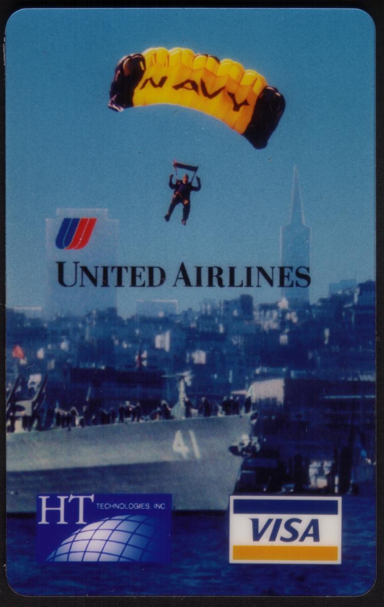 The second card features a dramatic scene of a Navy parachutist descending over a cityscape. The yellow parachute prominently shows the word "NAVY" in black letters. Below this, the United Airlines logo stands out above the HT Technologies, Inc. logo and a Visa payment symbol. The urban skyline includes identifiable high-rise structures, with the parachutist centered in the image.