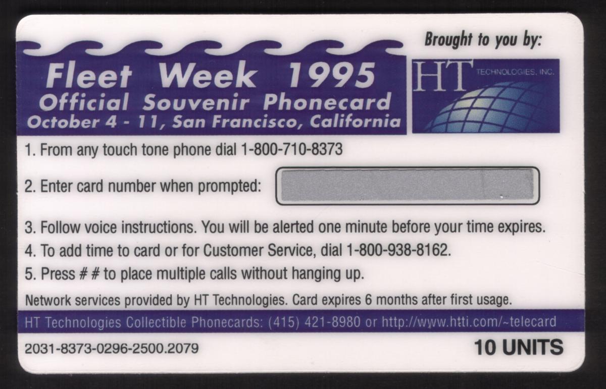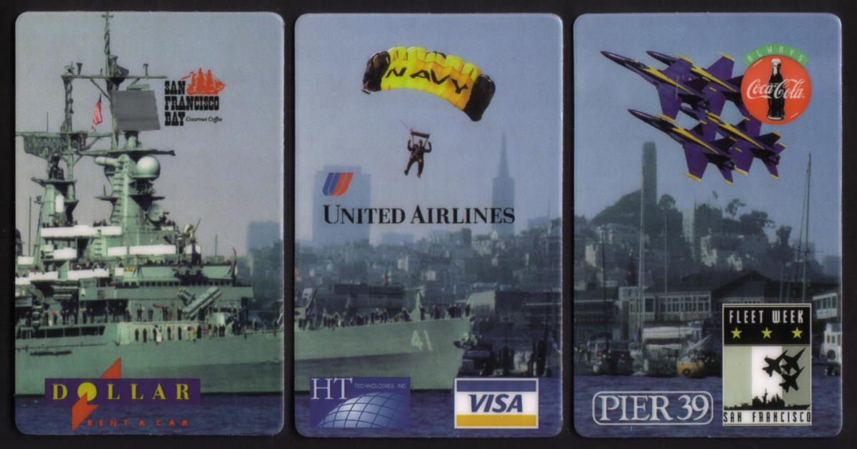These three collectible phone cards from Fleet Week 1995 San Francisco showcase distinct themes tied to military and local icons, featuring military and commercial brands alongside city landmarks.