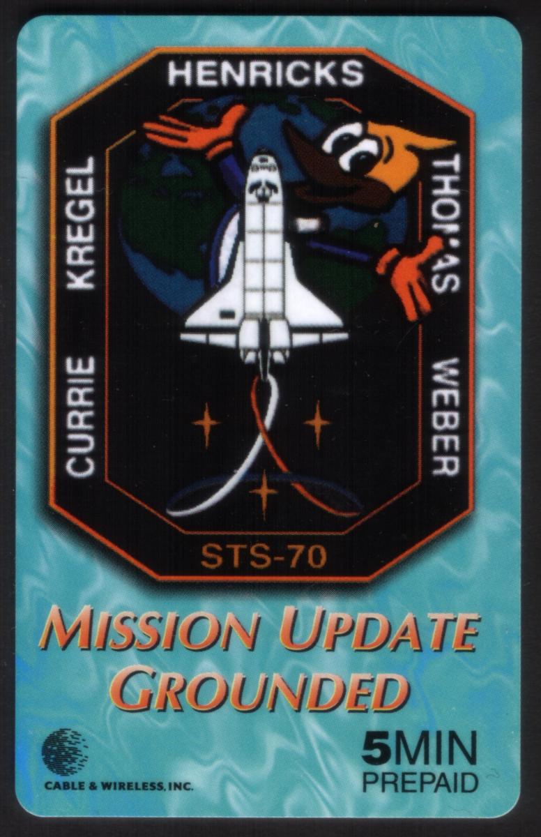 This phone card creatively connects with the STS-70 NASA shuttle mission and humorously references the program being "grounded (Because of Woodpeckers!)," integrating Woody Woodpecker into the theme. The card is designed for use with Cable & Wireless phone services and carries a colorful, space exploration motif with clear identification of the mission crew.
