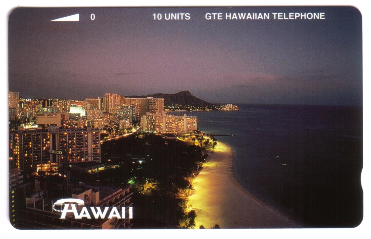 The word "HAWAII" is printed in white near the lower left corner of the card. The top edge includes the denomination "10 UNITS" and the text "GTE HAWAIIAN TELEPHONE," indicating the card's telecom issuer. The card displays a curved white arrow pointing from 0 to 10 units on the upper left side.