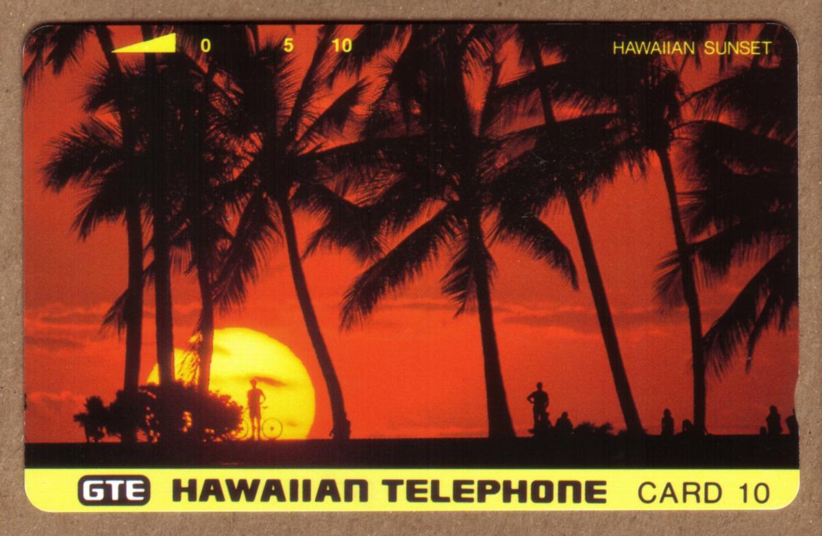 The card shows numbered units 0, 5, and 10 at the top center, indicating the card’s remaining value or usage for telephone calls. The overall design highlights the natural beauty of Hawaii’s beaches and palm trees during sunset, making it a visually appealing collectible item related to sightseeing and travel in Hawaii.